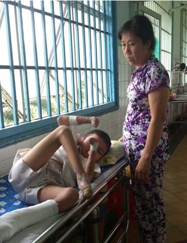 Sáng 30/8, chúng tôi tìm đến khoa Huyết học bệnh viện Chợ Rẫy TP.HCM, nơi Gia Bảo, người mắc bệnh lạ rụng tay, chân đang điều trị. Anh Bảo nằm trên chiếc băng ca kê ngoài hành lang. Khác với suy nghĩ của chúng tôi, Bảo tuy suy kiệt về hình thể; bàn tay, chân không còn nhưng ứng xử rất lanh lẹ.