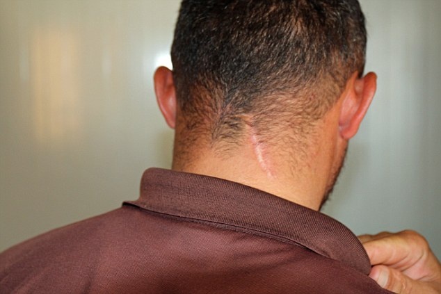 | Vết sẹo trên cổ của Jamal do đạn của phiến quân IS gây ra. Ảnh: Daily Mail |