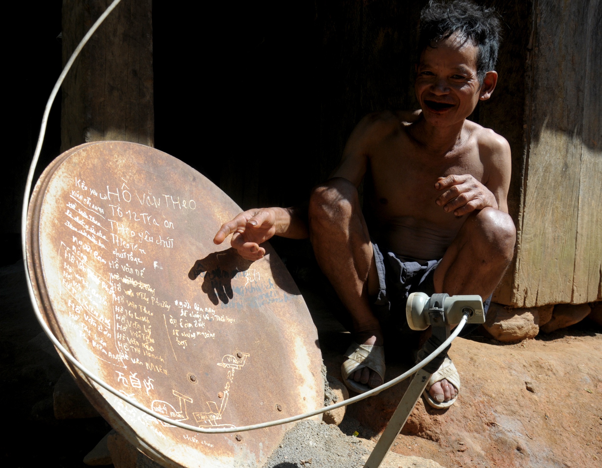 | Gia đình quá đông con, ông Dé bảo các con ghi họ tên theo thứ tự giữa lòng anten chảo parabol vừa dễ nhớ vừa tiện giới thiệu khi có khách đến nhà. "Vợ chồng tôi sinh tổng cộng mười người con, đứa lớn nhất 19 tuổi nghỉ học từ năm lớp 9 rồi đi làm thuê, đứa nhỏ nhất mới chỉ 4 tuổi. Đứa con trai thứ hai đến 4 tuổi thì chết vì bệnh kiết lỵ, con trai thứ tư mới 8 tháng tuổi cũng sớm lìa đời vì sốt cao, giờ chỉ còn 8 đứa", người cha thổ lộ. |