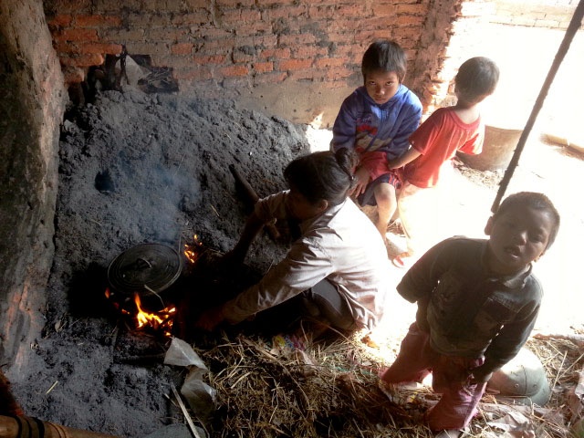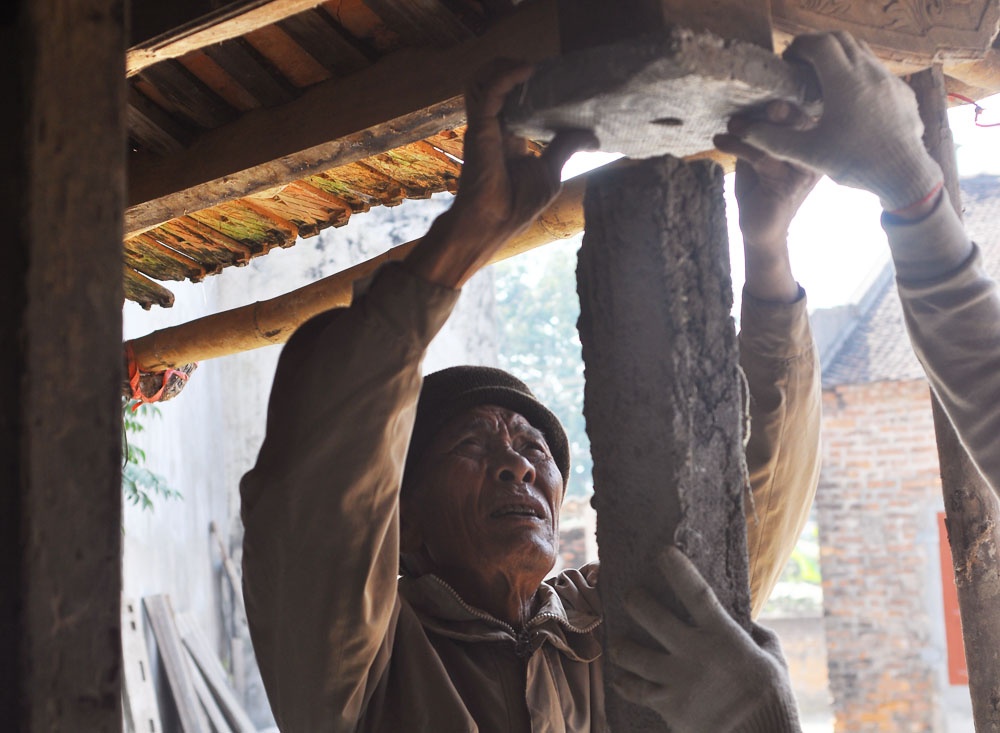| Năm nay đã 74 tuổi, bị nặng tai và mất toàn bộ sức lao động nên hàng ngày, hễ bà con hay ai cho bất cứ cái gì ông cũng chia đều cho tất cả các cháu. Trong ảnh, ông đang cùng sửa cột nhà chuẩn bị đón tết Giáp Ngọ 2014. |
