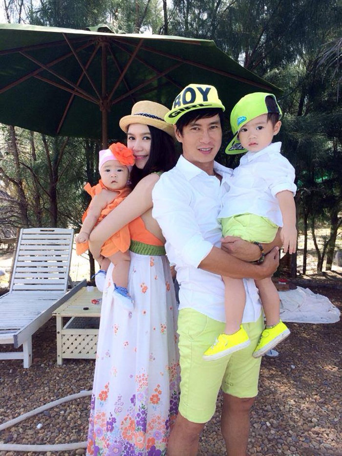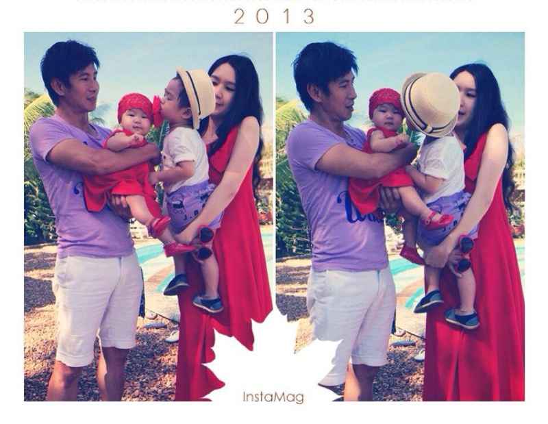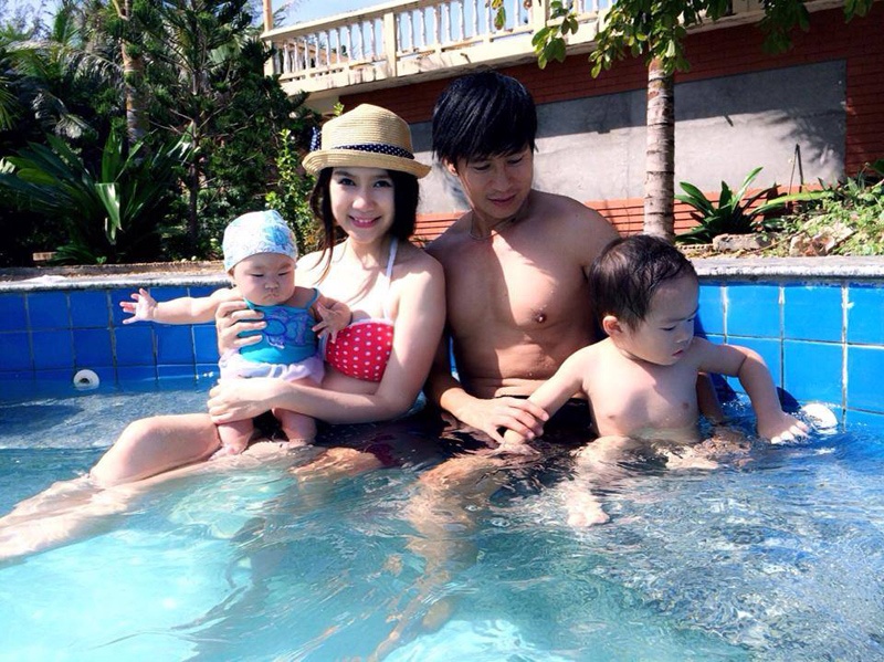 | Cả nhà chụp hình bên bể bơi. Kỳ nghỉ này cũng là món quà kỷ niệm 3 năm ngày cưới của cặp trai tài gái sắc. |