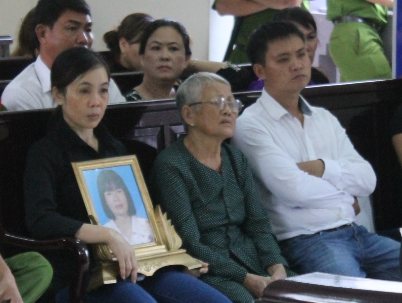 | Người thân mang di ảnh nạn nhân đến tòa. |