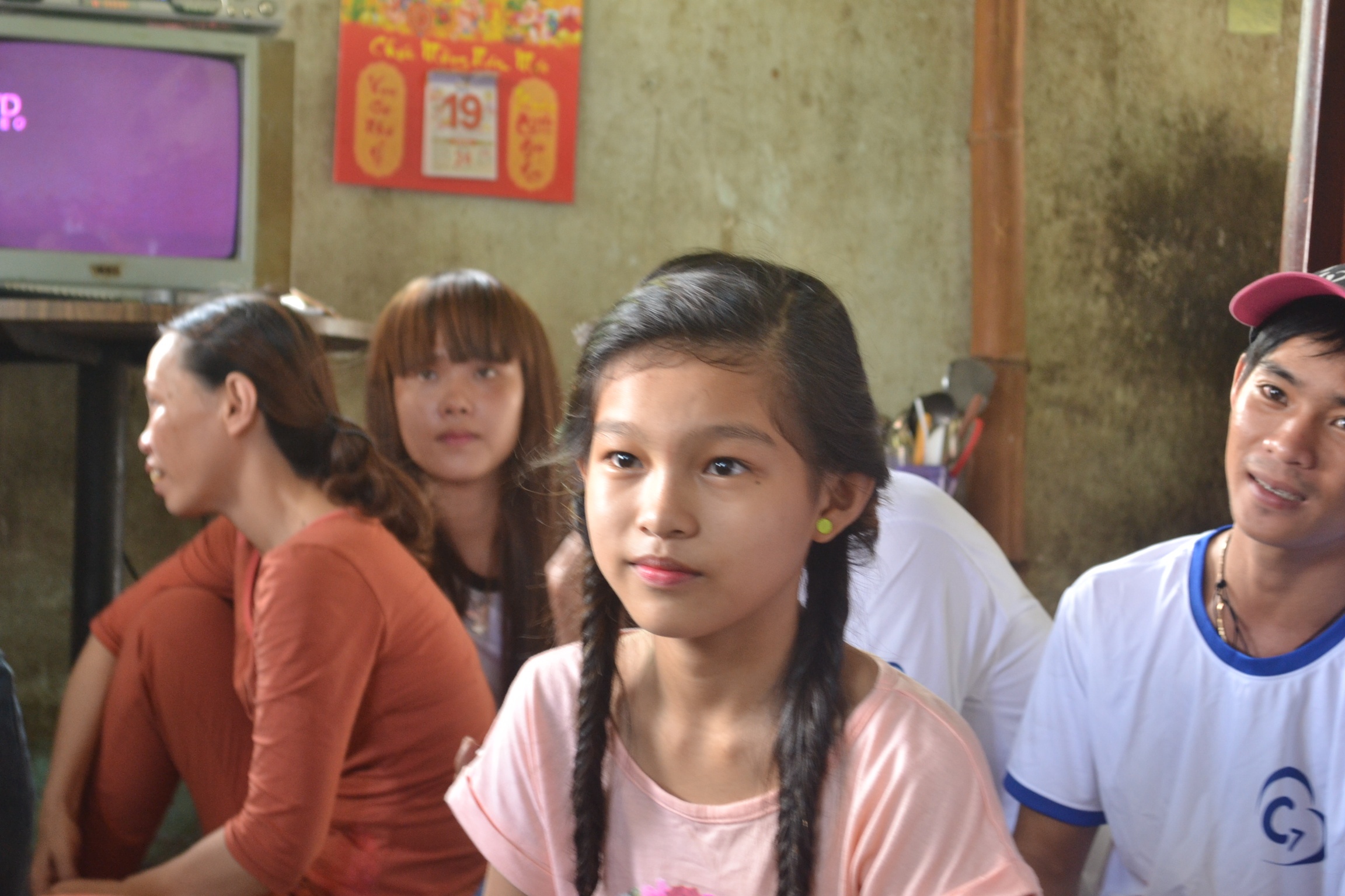Sau khi biết hoàn cảnh của thí sinh The Voice Kids, chiều 24/8, bố và chị gái cùng đông đảo người hâm mộ "chị Bảy" đã đến nhà thăm hỏi, tặng quà cho bé Thu Hiền.