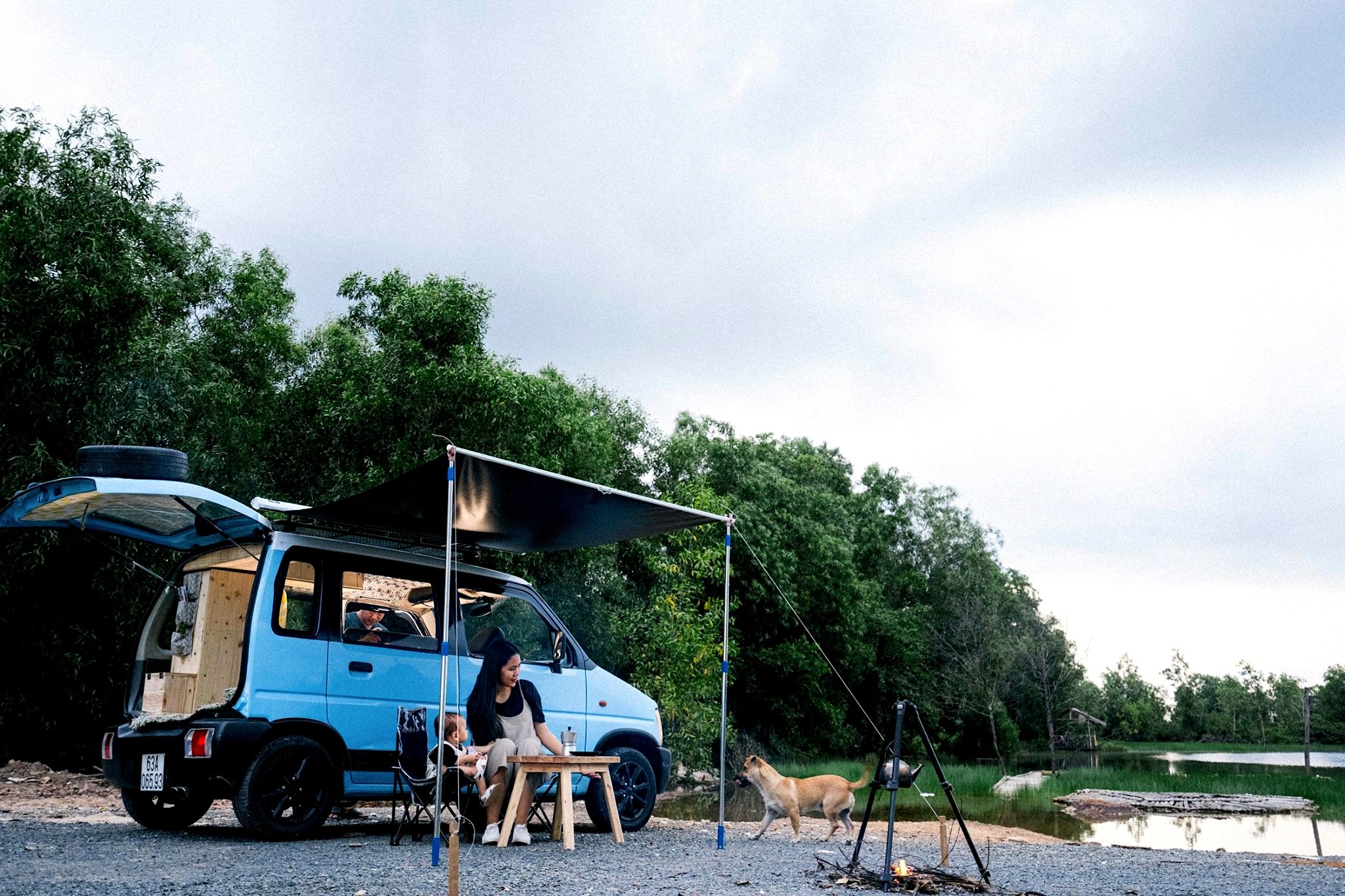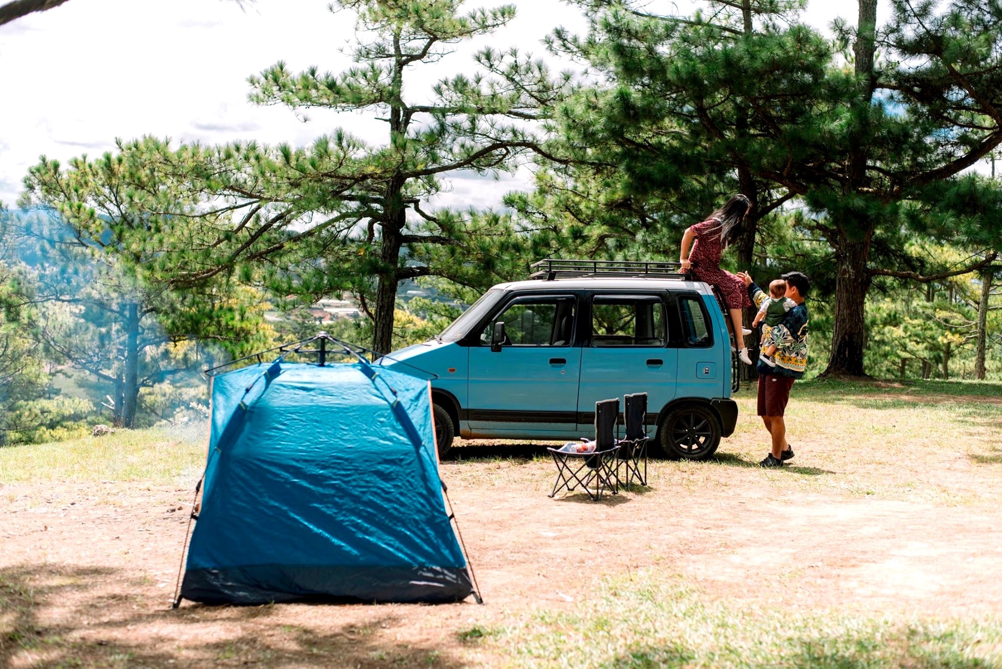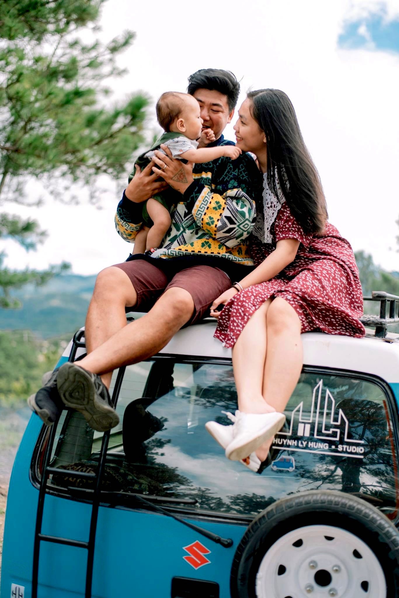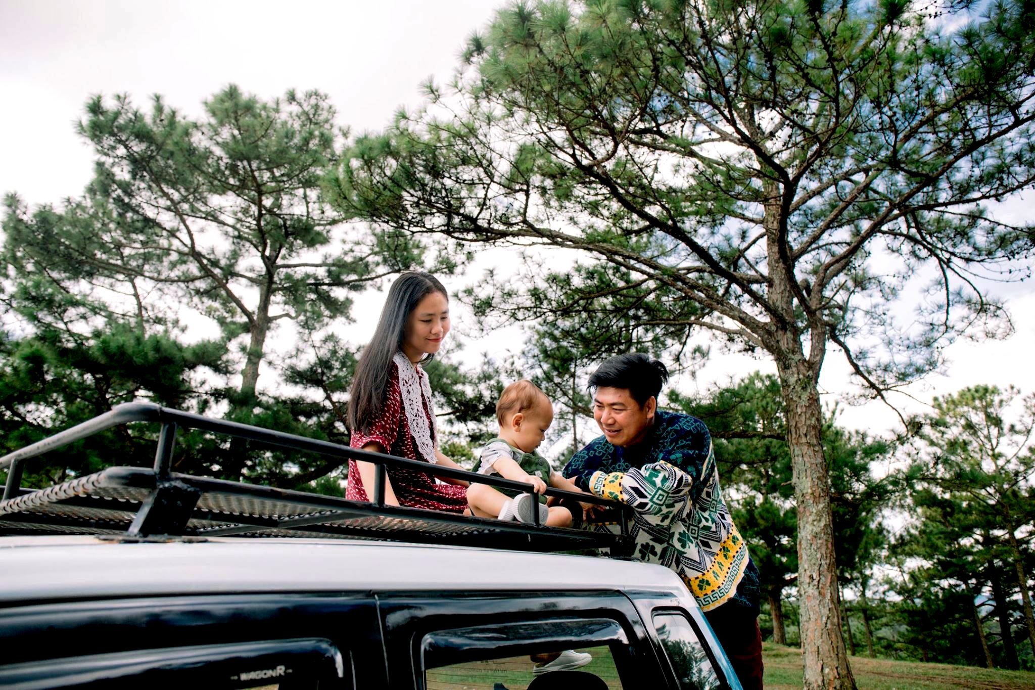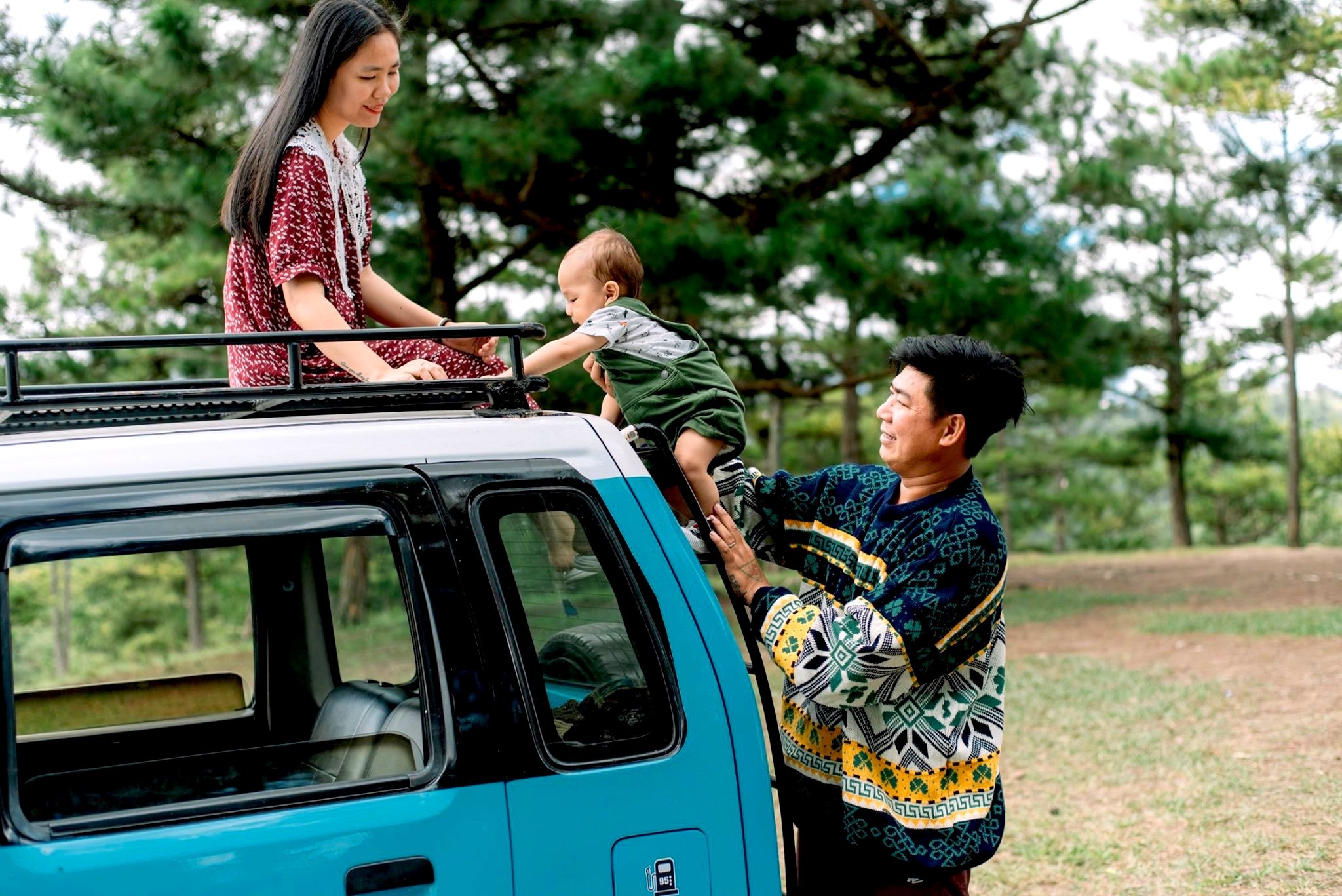Gia đình 3 người rong ruổi khắp chốn cùng chiếc ôtô màu xanh