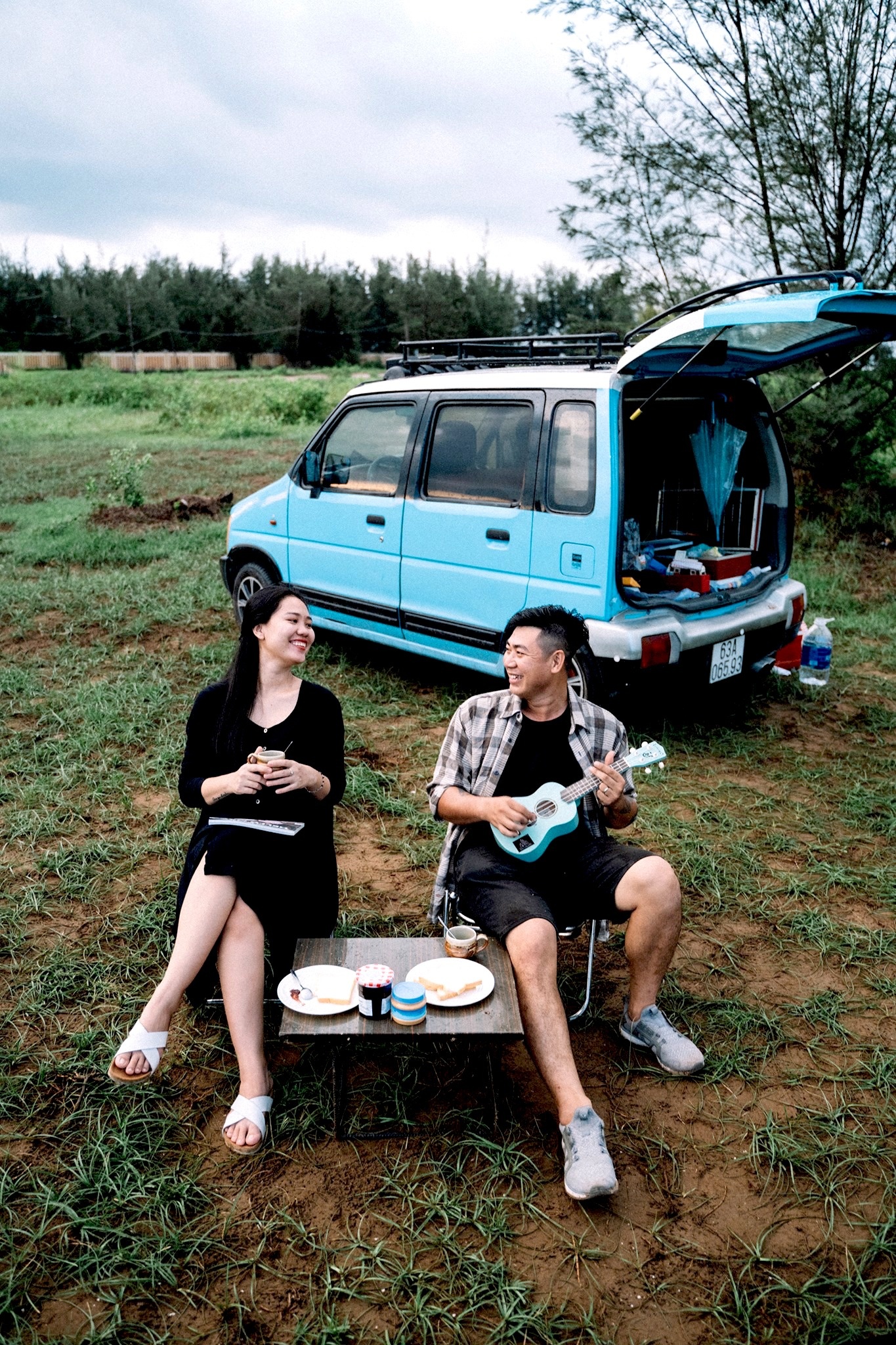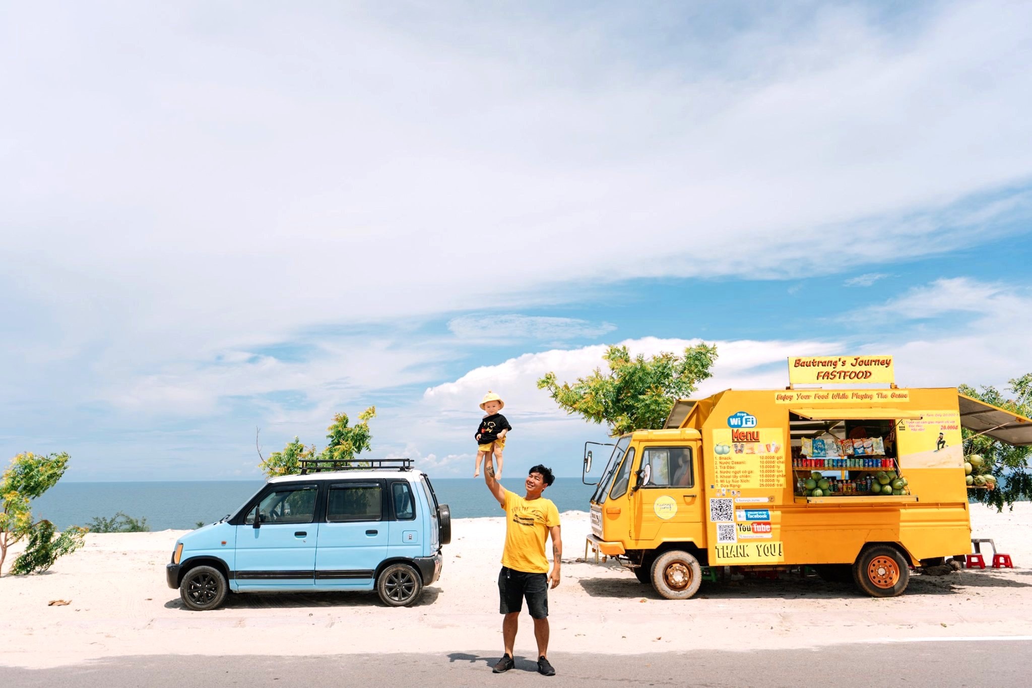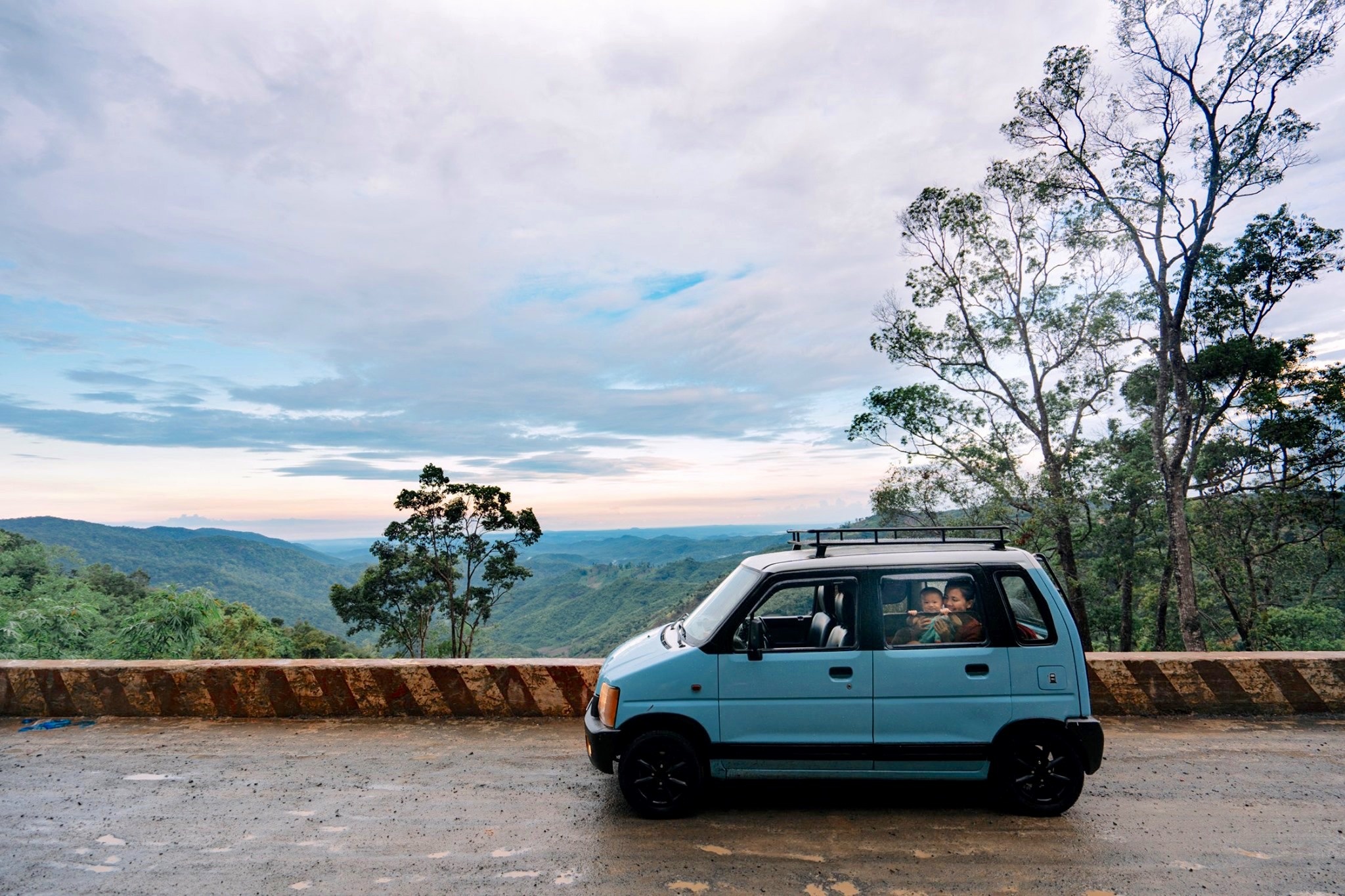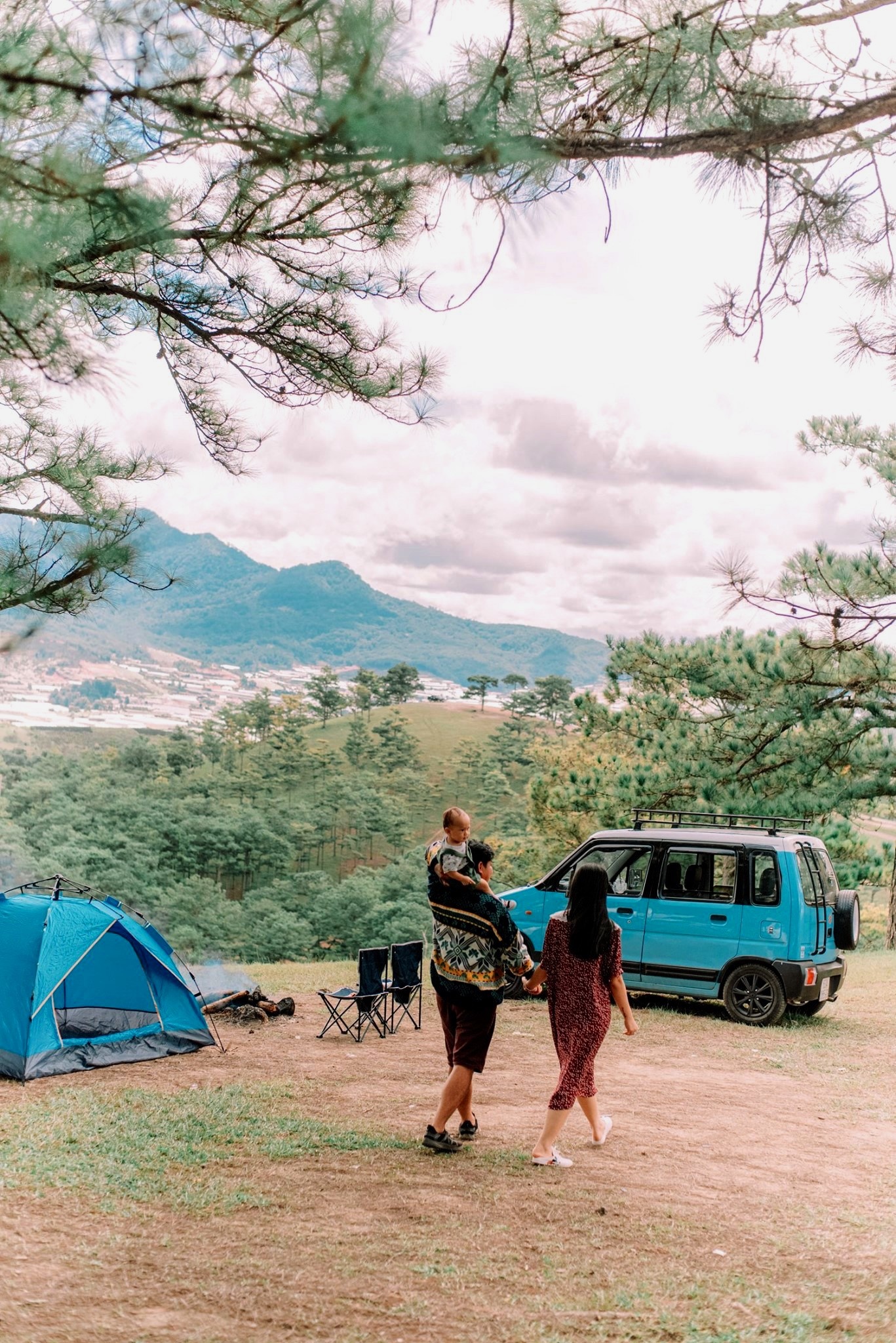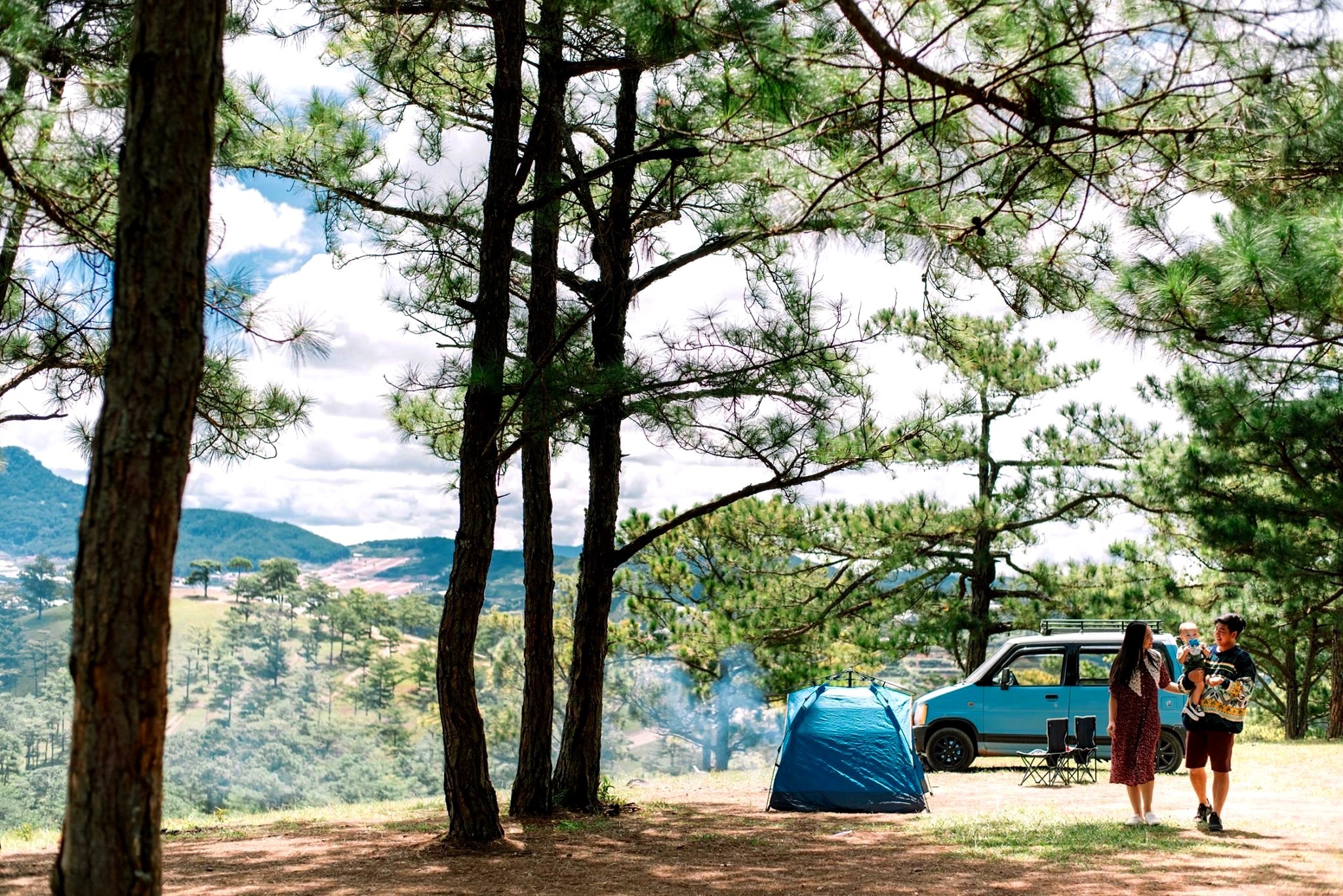 Gia đình 3 người rong ruổi khắp chốn cùng chiếc ôtô màu xanh