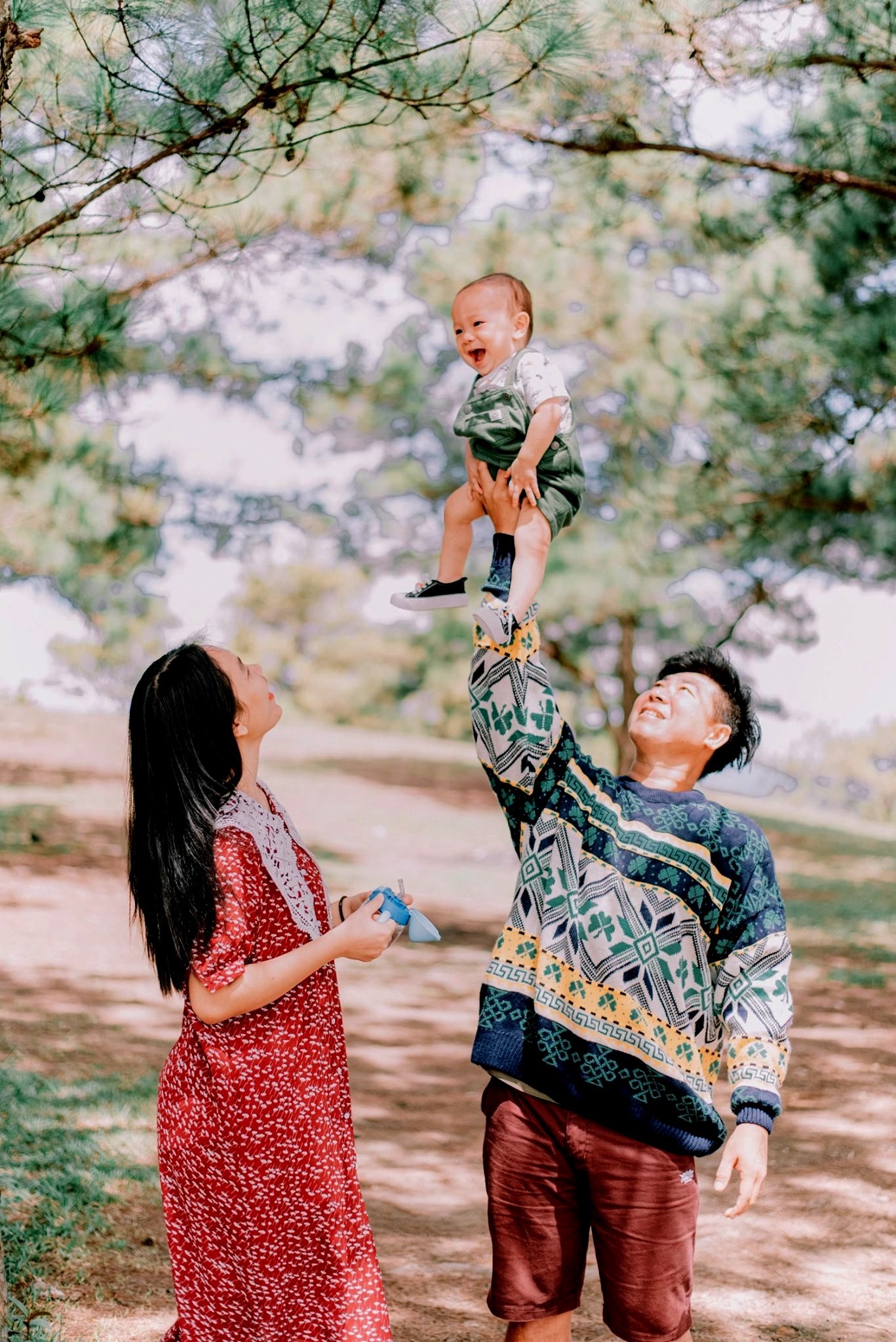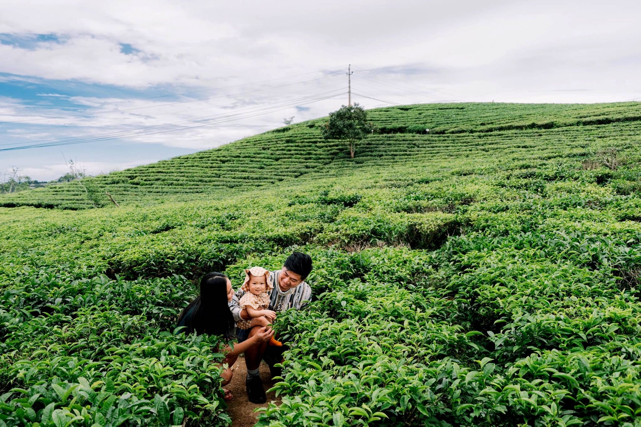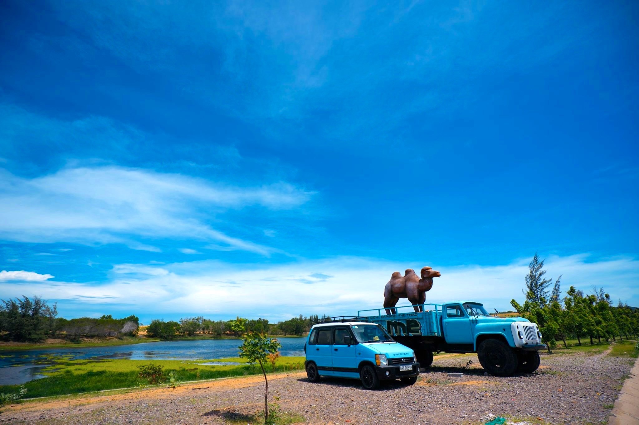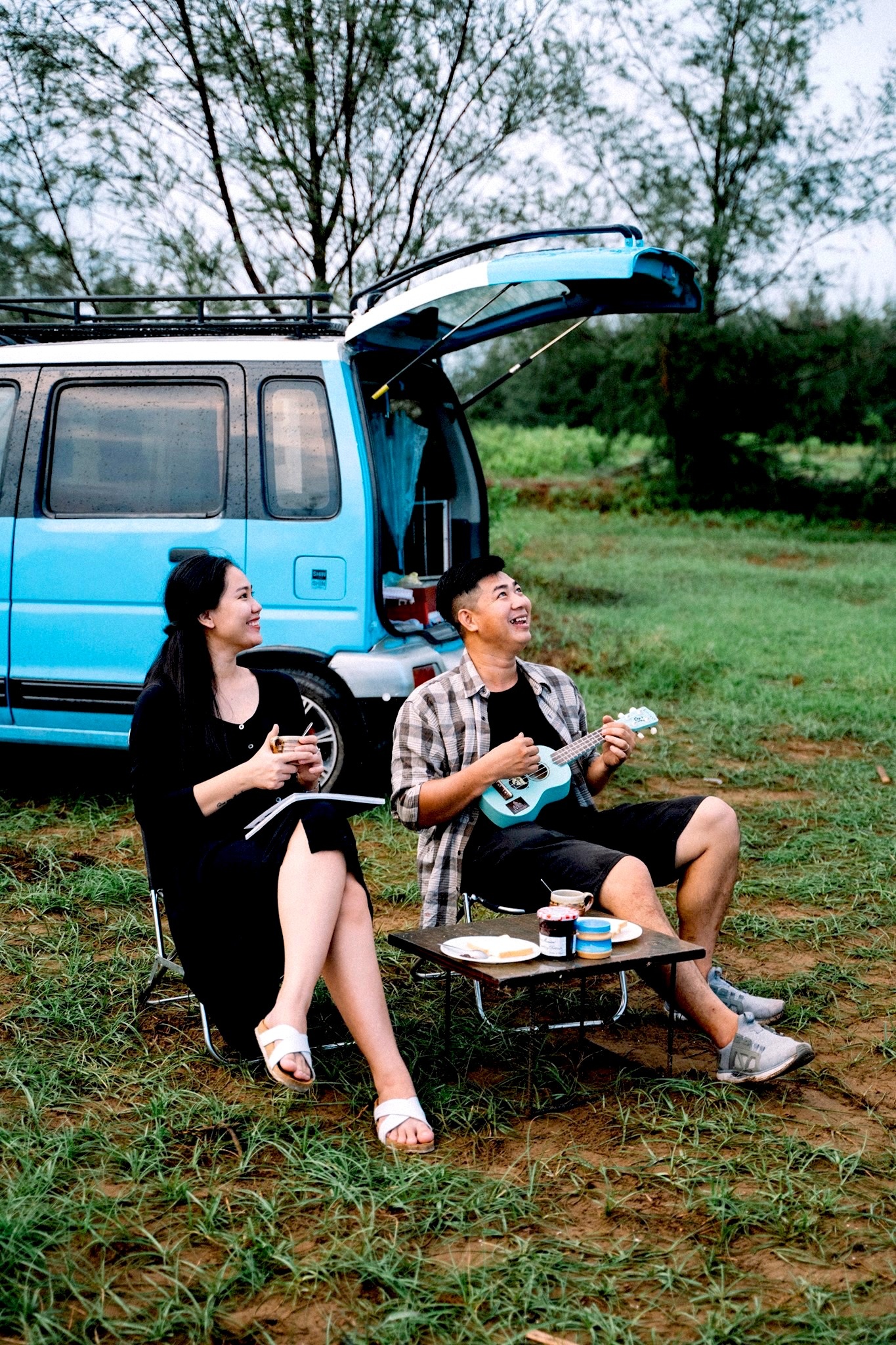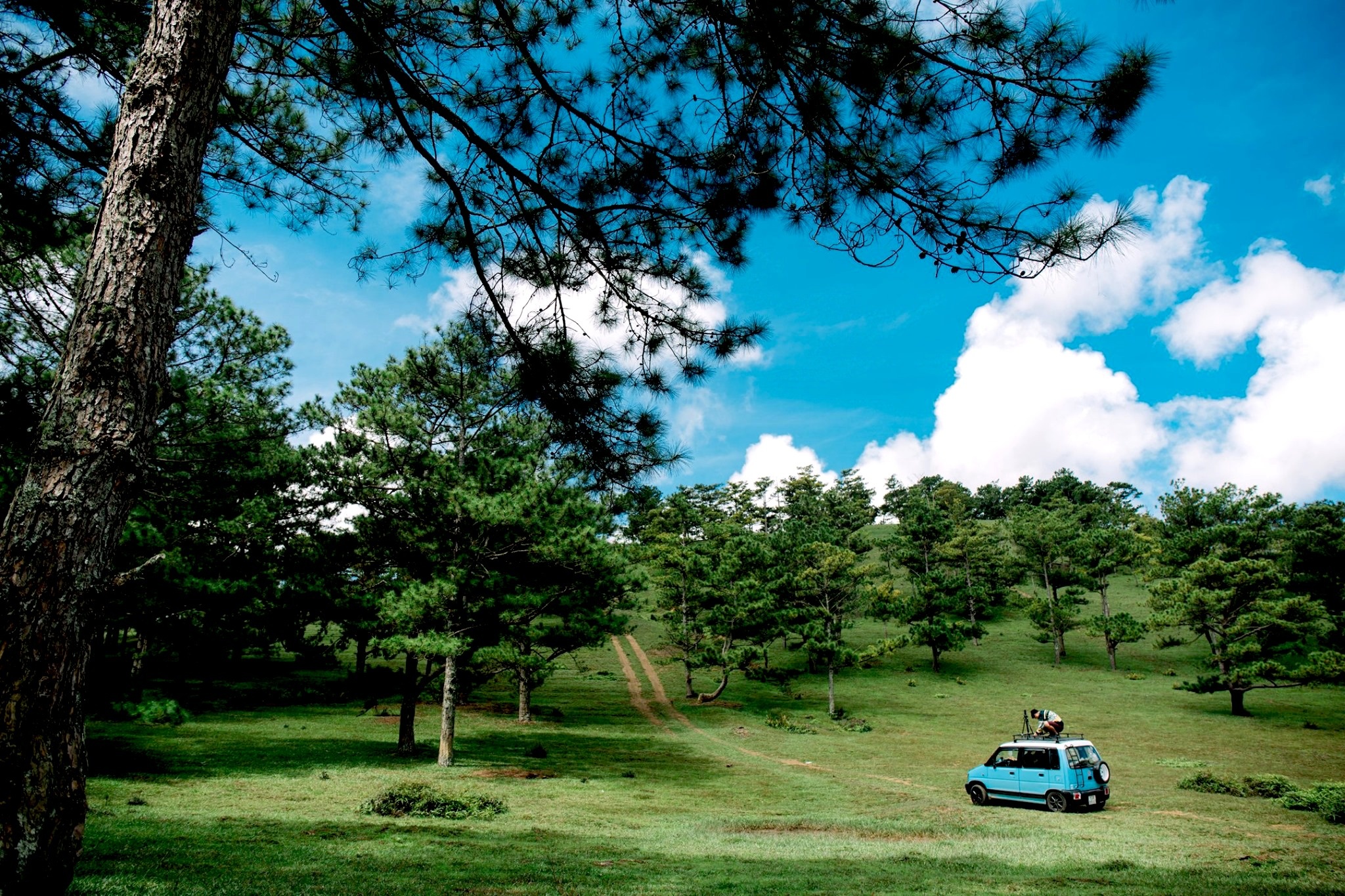 Gia đình 3 người rong ruổi khắp chốn cùng chiếc ôtô màu xanh