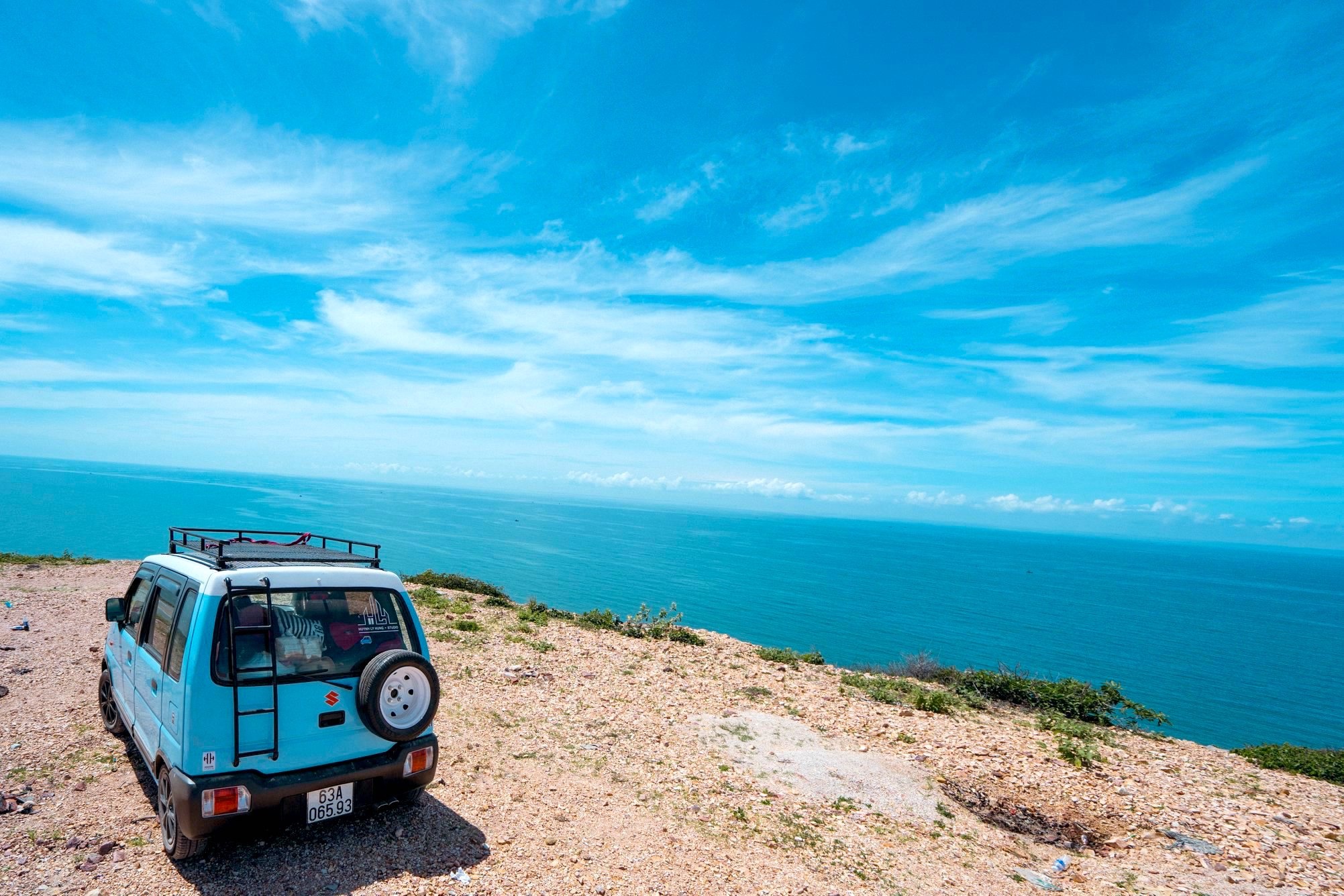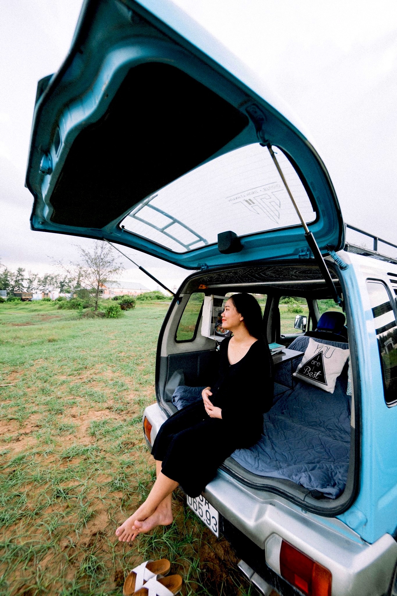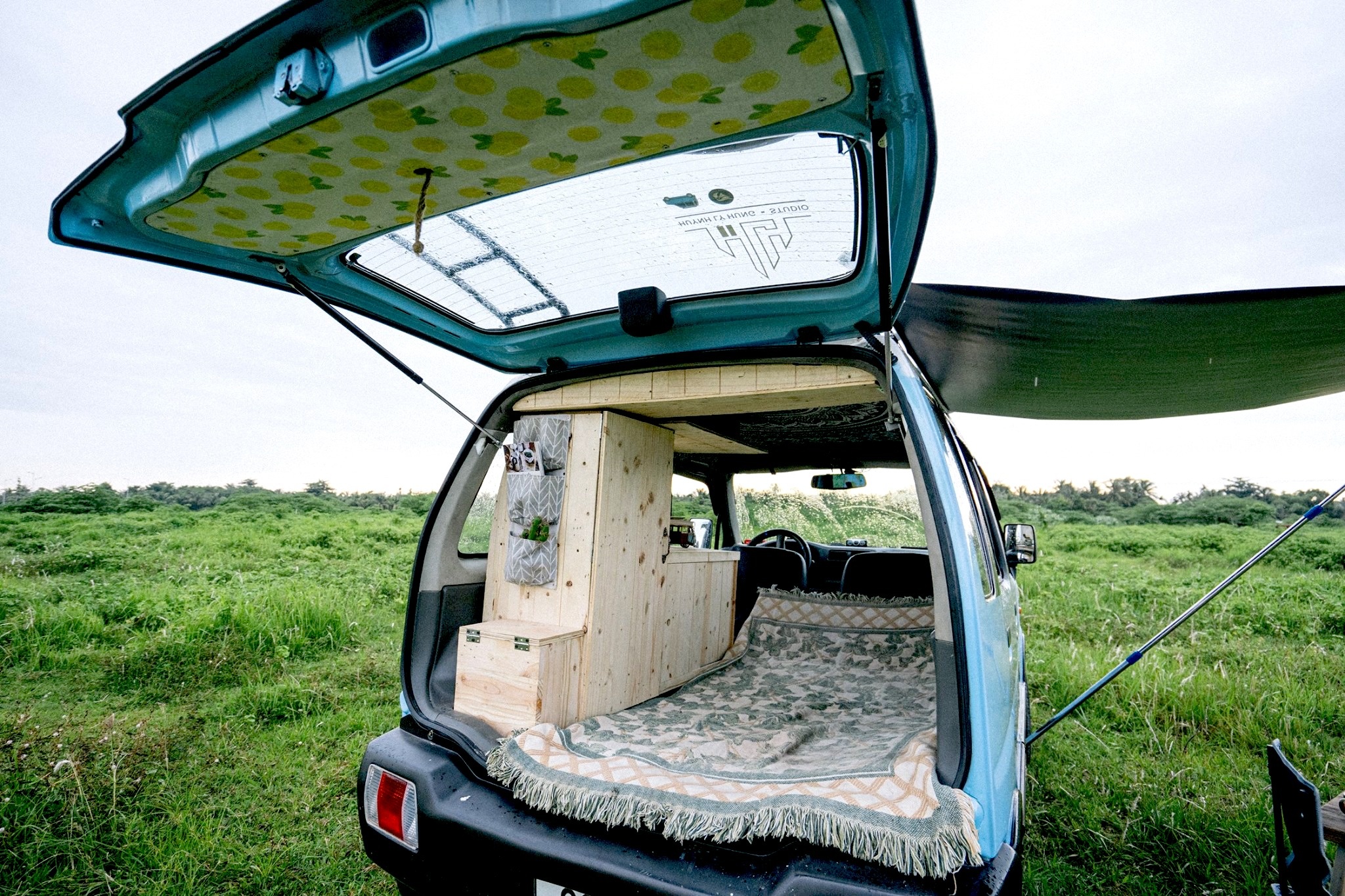 Vốn chung niềm đam mê đi phượt, anh Hùng và vợ đã ấp ủ mua ôtô kể từ khi có em bé để cả nhà cùng nhau chinh phục nhiều vùng đất mới bất kể nắng, mưa. Chia sẻ với Zing, anh Hùng cho biết: "Với nguồn tài chính eo hẹp, vợ chồng tôi quyết định mua chiếc ôtô cũ giá 90 triệu đồng. Sau đó, cả hai thêm nhiều tiện ích khác giúp việc di chuyển thuận tiện". Vì muốn tân trang chiếc xe tựa ngôi nhà di động, anh chị tham khảo các video trên mạng và tự mua vật liệu để cải tạo nhằm tiết kiệm chi phí. Sau gần 1 năm, nội thất xe được hoàn thiện với giường, tủ, kệ, vòi hoa sen... và trở nên nổi bật nhờ lớp sơn màu xanh hút mắt. Nói về "người bạn đồng hành" của mình, anh Hùng hào hứng bày tỏ: "Xe nhìn bên ngoài nhỏ gọn, nhưng bên trong khá rộng và thoáng. Chiếc ôtô không chỉ là phương tiện giúp hành trình thêm thuận lợi mà nó còn mang kỷ niệm của hai vợ chồng. Trên những cung đường dọc mảnh đất hình chữ S, chúng tôi đi chậm để cảm nhận trọn vẹn vẻ đẹp trong từng hành trình mà mình đã qua".