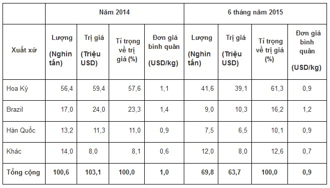 * Thống kê nhập khẩu thịt gà các loại năm 2014 và 6 tháng năm 2015 vào VN: