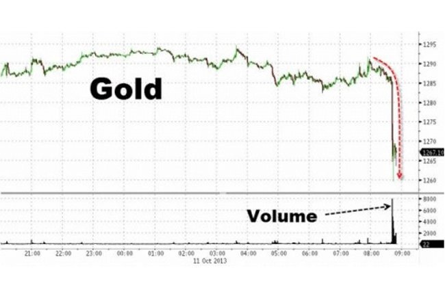 Lúc 12h42 GMT, tức 8h sáng nay 12/10 giờ Hà Nội, giao dịch vàng kỳ hạn tại sàn giao dịch Chicago (CME) bị ngưng vài phút do sau khi xuất hiện lệnh bán vàng lớn, cơ chế stop logic của CME tự động kích hoạt, ngăn chặn biến động giá quá mức. Trước và sau khoảng thời gian bị ngưng giao dịch 3 phút, giá vàng kỳ hạn giảm khoảng 30 đô la Mỹ/ounce, tương đương 2%.