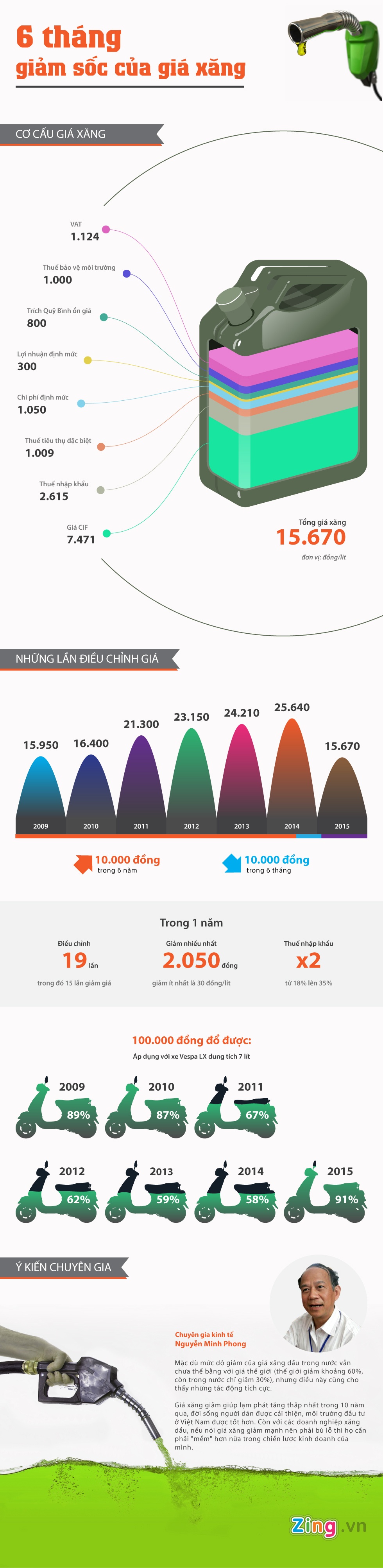Từ năm 2009 đến năm 2014, xăng tăng 10.000 đồng/lít lên mức cao kỷ lục 25.640 đồng. Tuy nhiên, chỉ cần 6 tháng giảm liên tiếp, giá đã quay trở về mức tương đương năm 2009.