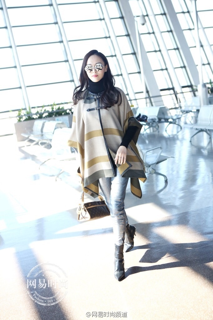 Đường Yên trẻ trung với áo choàng trùm và quần jeans, phối túi LV khi xuất hiện tại sân bay ngày mùng 3 Tết.