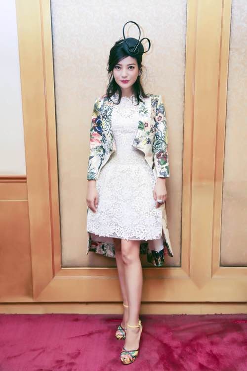 Khi dự một sự kiện chào xuân, Triệu Vy điệu đà với váy của thương hiệu Monique Lhuillier. trang sức Tasaki.