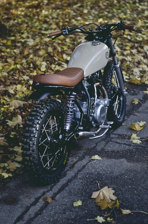 SR250 là mẫu xe Nhật được sản xuất năm 1982 với kiểu dáng bệ vệ, thích hợp với phong cách cổ điển mà bây giờ được gọi là ông già. Chính bởi vậy, giống như trao lưu chung của phong cách độ tracker nở rộ từ năm 2000, Auto Fabrica đã triệt để cắt gọt những phần thừa thãi như chắn bùn, tấm chắn xích, cụm đồng hồ, yên xe xa-lông với mục đích “giảm cân” tối đa, giải phóng khung càng nhiều càng tốt. Nhờ vậy khối động cơ xi lanh đơn, chế hòa khí vốn được coi là nhỏ bé so với thiết kế cũ đã trở nên đường bệ hơn. Đây là yếu tố quan trọng để tạo cảm giác cơ bắp cho mẫu xe dung tích xi-lanh nhỏ, đặc biệt thịnh hành tại Việt Nam.