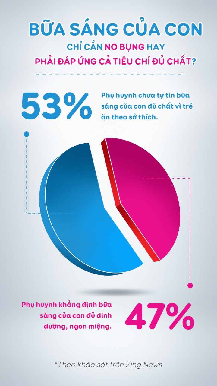 Một khảo sát trên Zing News cho kết quả có đến 47% độc giả được hỏi không tự tin khẳng định bữa sáng của con đủ chất. Quỹ thời gian eo hẹp nên nhiều mẹ có thói quen chọn bữa sáng nhanh gọn, theo sở thích của con. Điều này khiến dinh dưỡng trẻ nhận được chưa tối ưu, về lâu dài có thể ảnh hưởng đến sự phát triển thể chất toàn diện. Vậy cho con ăn gì nhanh gọn mà vẫn đảm bảo cơ thể được “sạc” đủ năng lượng?