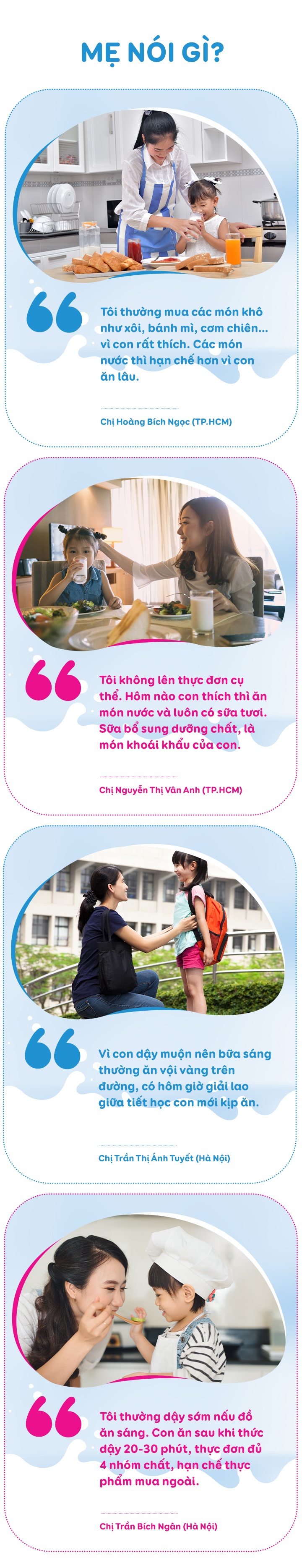 Không phải mẹ nào cũng có điều kiện tự tay chuẩn bị bữa sáng cho con. Kỳ công nấu nhiều món thì không đủ thời gian; để con ăn mãi bún, phở... lại dễ ngán. Do đó, đa phần các mẹ chọn món đơn giản, chế biến nhanh gọn nhưng đảm bảo nguyên tắc lành mạnh, đủ chất.