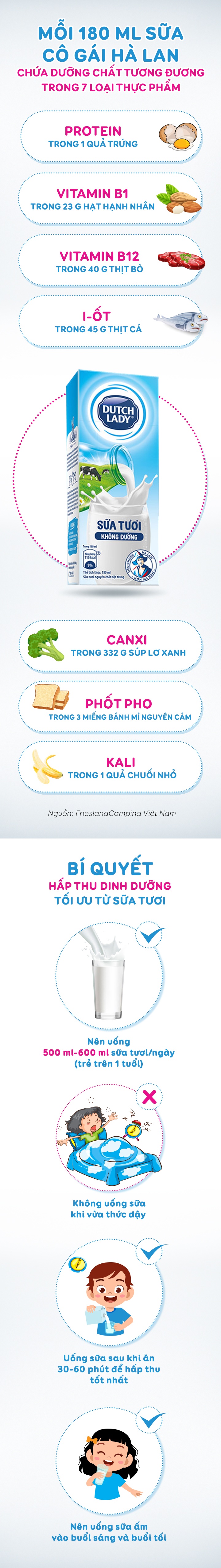 Chứa các nhóm chất như protein, chất béo, vitamin và khoáng chất, đồng thời có hàm lượng canxi cao và phốt pho cân đối…, sữa tươi bổ sung dinh dưỡng cần thiết cho sự phát triển trí não, thể chất của trẻ. Đơn cử, thưởng thức một hộp sữa Cô Gái Hà Lan, con nhận được hàm lượng protein tương đương một quả trứng, lượng canxi từ 332 g súp lơ xanh, lượng kali gần bằng một quả chuối nhỏ, nhóm các vitamin B1, B12, i-ốt, phốt pho...