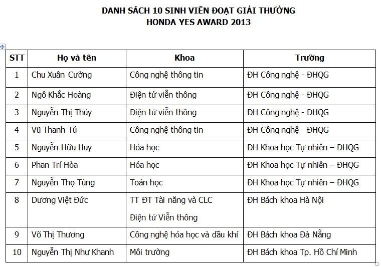 Với các tiêu chí đánh giá rõ ràng cùng quy trình tuyển chọn chặt chẽ và công bằng, sau 3 vòng thi, Ủy ban Tuyển chọn đã lựa chọn được 10 bạn sinh viên xuất sắc nhất vinh dự nhận giải thưởng Honda YES 2013 gồm: 1 sinh viên ĐH Bách Khoa Hà Nội, 4 sinh viên ĐH Công nghệ - ĐHQG HN, 3 sinh viên ĐH Khoa học Tự nhiên – ĐHQG HN, 1 sinh viên ĐH Bách khoa Đà Nẵng và 1 sinh viên ĐH Bách khoa TP.HCM.