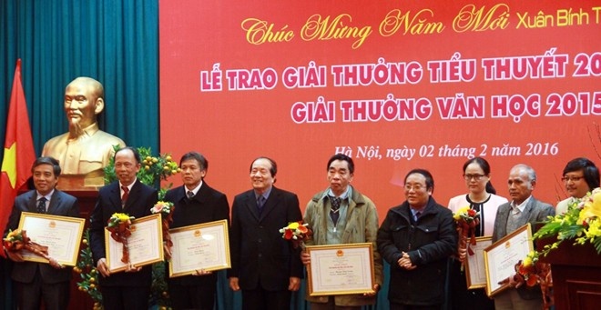 | Tác giả Trần Thanh Cảnh (ngoài cùng bên trái) trong buổi lễ trao giải thưởng Hôi nhà văn Việt Nam 2015 vừa qua. |