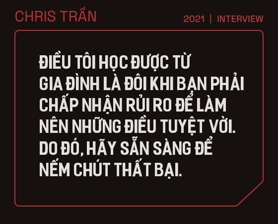 Điều tôi học được từ gia đình là đôi khi bạn phải chấp nhận rủi ro để làm nên những điều tuyệt vời. Do đó, hãy sẵn sàng để nếm chút thất bại. Khi mọi thứ không diễn ra như mong muốn, chúng ta luôn có một nơi để tựa vào, đó là gia đình và bản sắc văn hóa của mình.