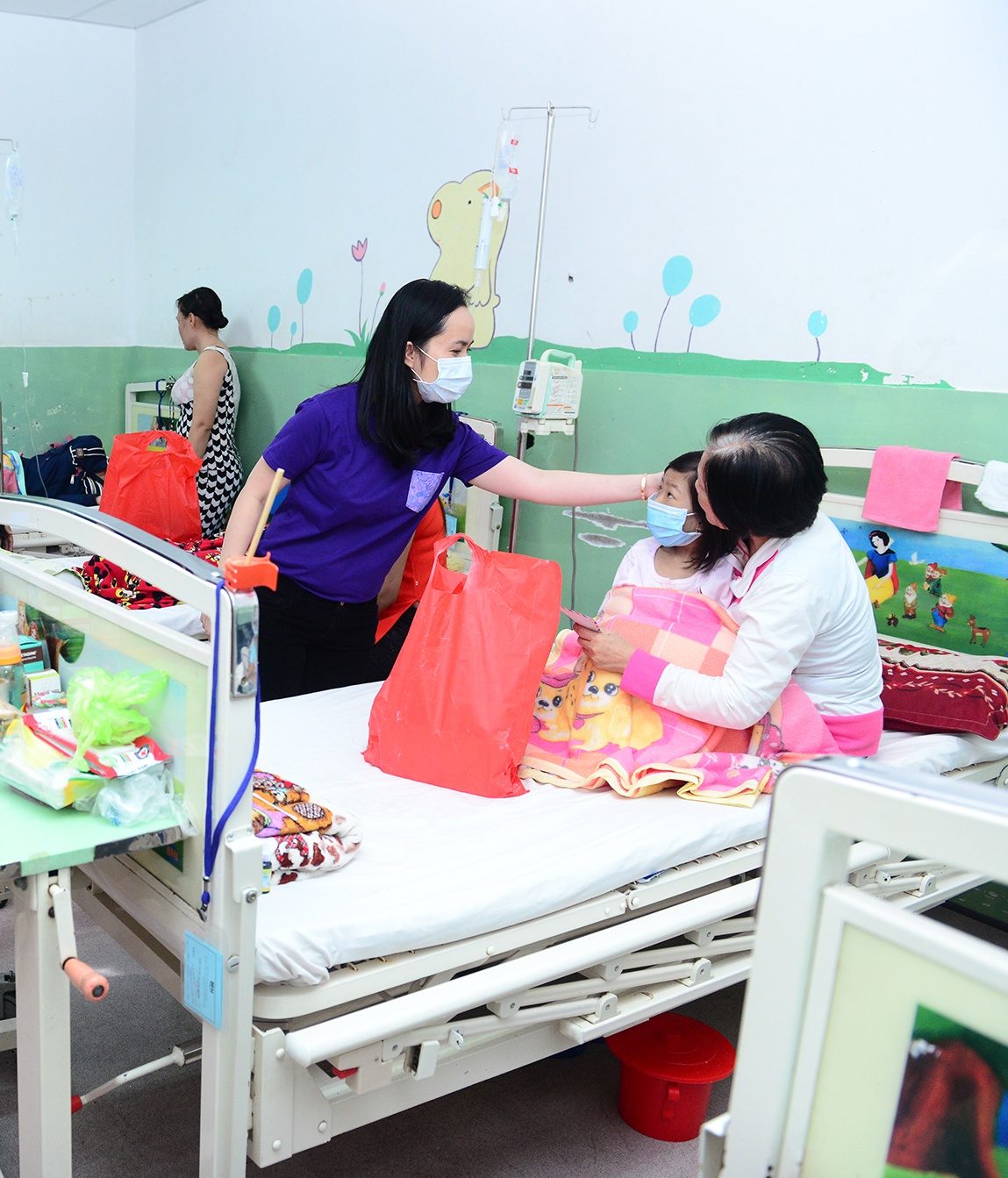 | Bà Nguyễn Đặng Quỳnh Anh đến thăm và trao quà cho các bé trong khu vực điều trị cách ly, vô trùng. |