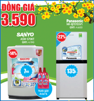Đồng giá 3,59 triệu đồng cho bộ đôi máy giặt Sanyo, tủ lạnh Panasonic