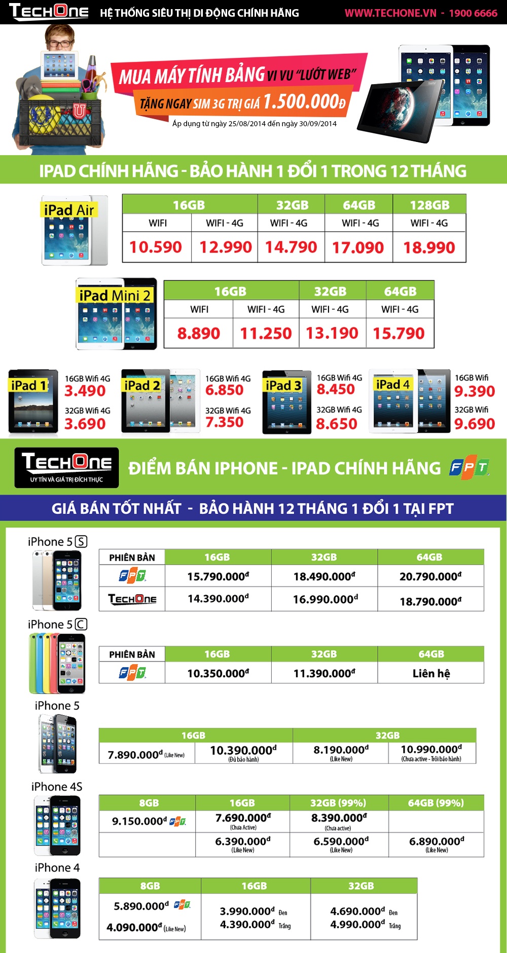 Mừng Quốc khánh mùng 2/09, TechOne hạ giá loạt máy tính bảng hàng hiệu tới 30% trừ thẳng tiền mặt vào hóa đơn mua hàng. Không chỉ thế quý khách hàng còn được nhận ngay SIM 3G dùng cả năm trị giá 1,5 triệu.