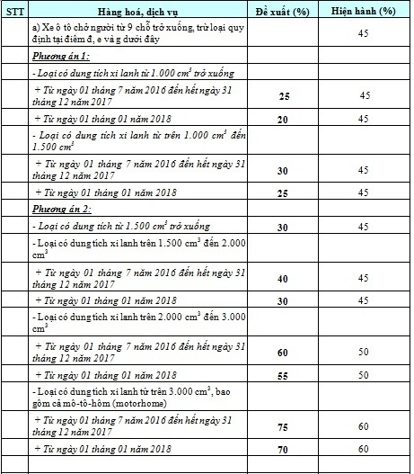 Cụ thể, dự thảo đề xuất giảm mức thuế suất thuế TTĐB đối với các dòng xe có dung tích xi lanh từ 2.000 cm3 trở xuống; tăng mức thuế suất đối với các dòng xe có dung tích xi lanh từ 2.000 cm3 trở lên. Đồng thời, giảm mức thuế suất đối với các dòng xe chở người từ 10 đến dưới 16 chỗ, từ 16 đến dưới 24 chỗ và điều chỉnh thuế suất đối với xe vừa chở người vừa chở hàng. Cụ thể: