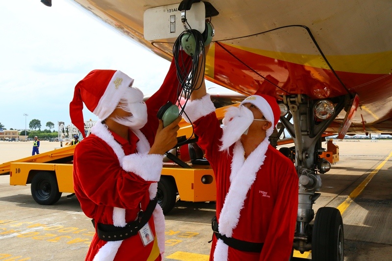 | Kỹ thuật viên trong trang phục ông già Noel miệt mài làm việc ngoài sân bay để đảm bảo những chuyến bay an toàn cho hành khách. |
