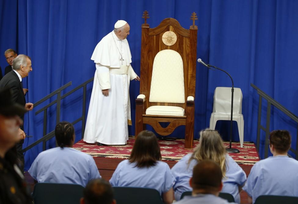 Dù tiếp xúc với những người đang phải thụ án vì phạm pháp, Giáo hoàng vẫn không ngần ngại ôm hôn. Trước đó, người cũng dừng xe để ban phước cho một cậu bé bại não.