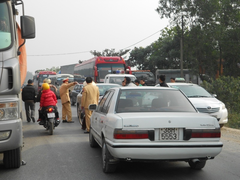 | Nhận được thông tin, lực lượng CSGT hai huyện Quảng Xương - Tĩnh Gia đã có mặt điều tiết giao thông, tìm phương án giảm ùn tắc. |