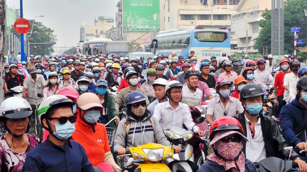 | Hàng trăm xe máy, ôtô, xe buýt kẹt cứng trên cầu Lê Văn Sỹ trong giờ cao điểm. |