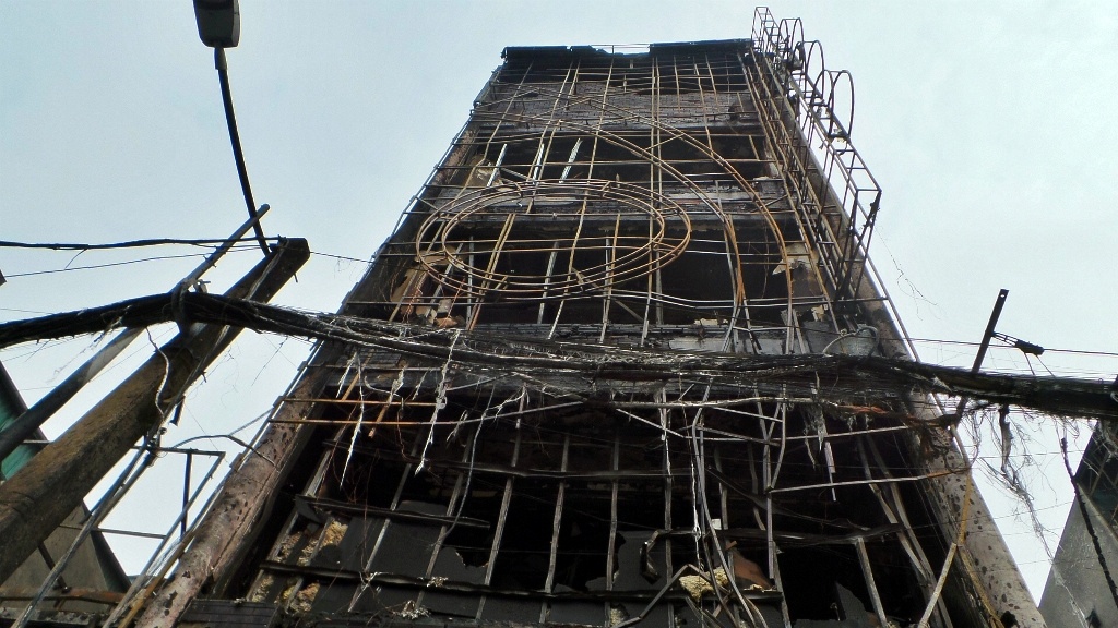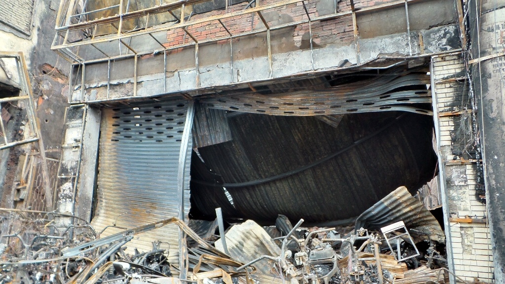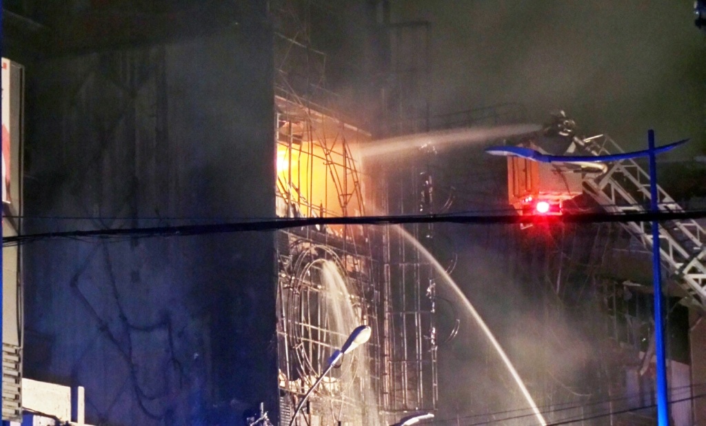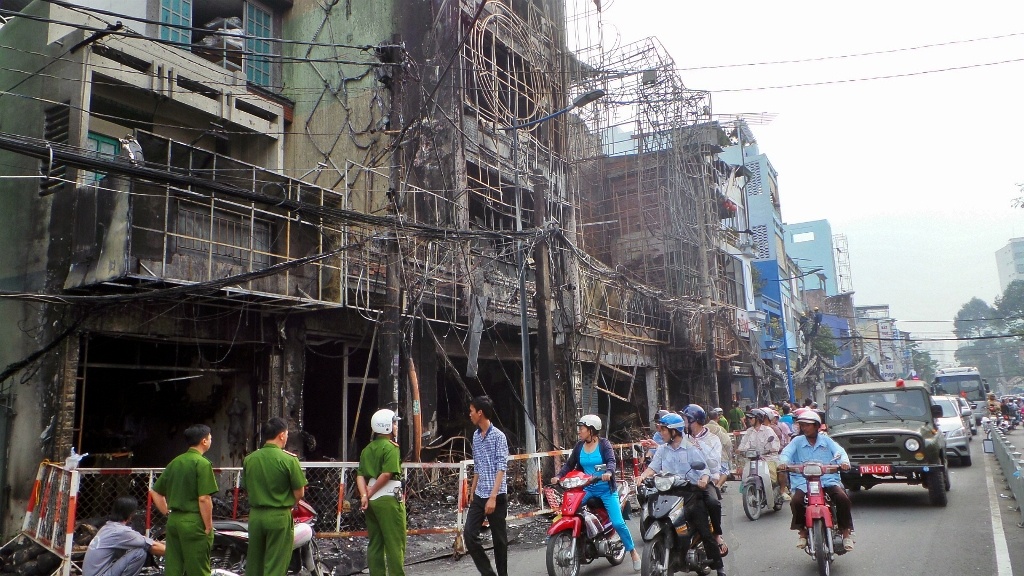 | Hình ảnh quán karaoke Idol cháy trơ khung. Phó chủ tịch UBND TP.HCM Tất Thành Cang đã có mặt trong đêm chỉ đạo công tác chữa cháy. Tại cuộc họp báo, ông Cang cho biết do 2 quán karaoke có cách âm, dễ cháy nên khi xảy ra hỏa hoạn việc đưa phương tiện vào có phần khó khăn. |