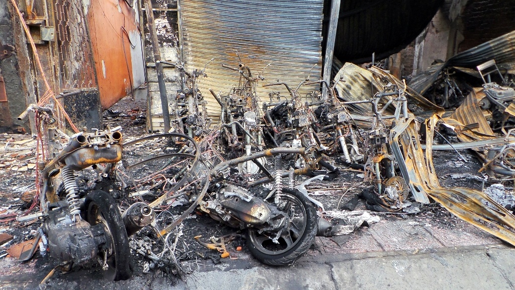 | Hàng chục xe máy từ các căn nhà cháy bị thiêu rụi, trơ khung, đa số là xe tay ga đắt tiền. |
