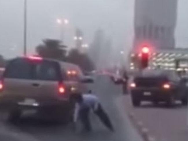 | Tài xế đừng xe giữa đường để nhặt tiền. Ảnh: Daily Mail |