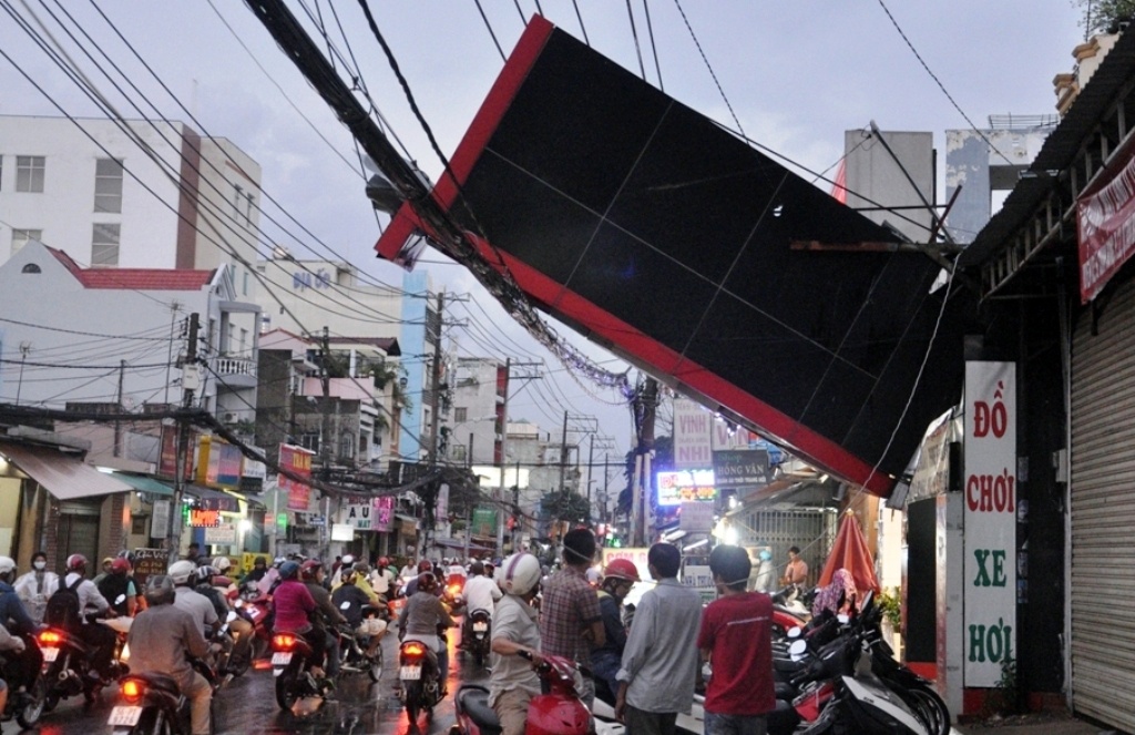 | Khoảng 17h ngày 28/7, tại địa bàn quận Tân Bình, TP HCM bắt đầu có mưa lớn kèm theo gió giật mạnh. Biển hiệu của một cửa hàng điện thoại di động trên đường Âu Cơ, có diện tích khoảng 3,5 x 4 m, nặng hàng trăm kg ngã nhào ra đường. |