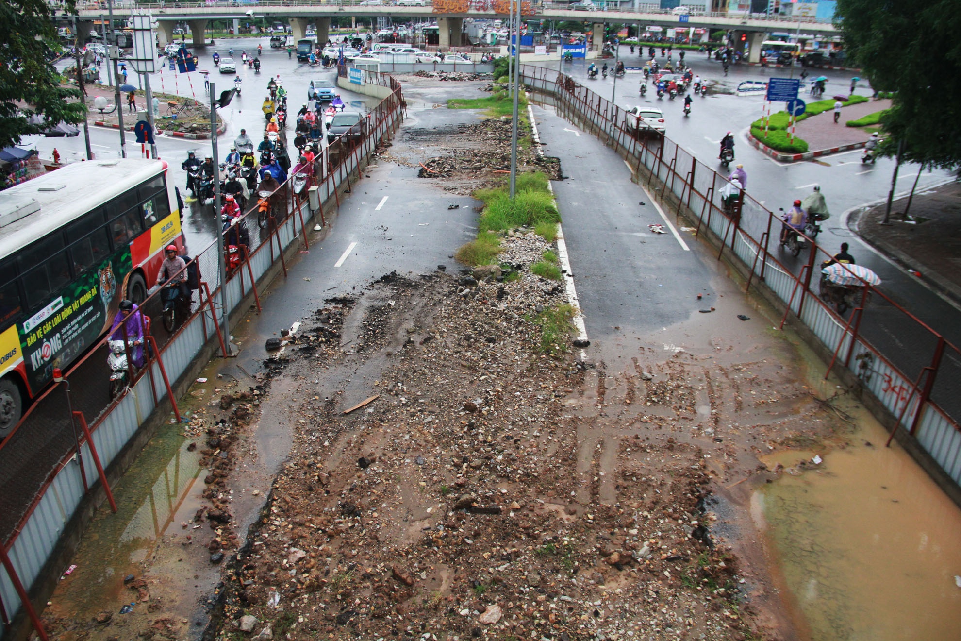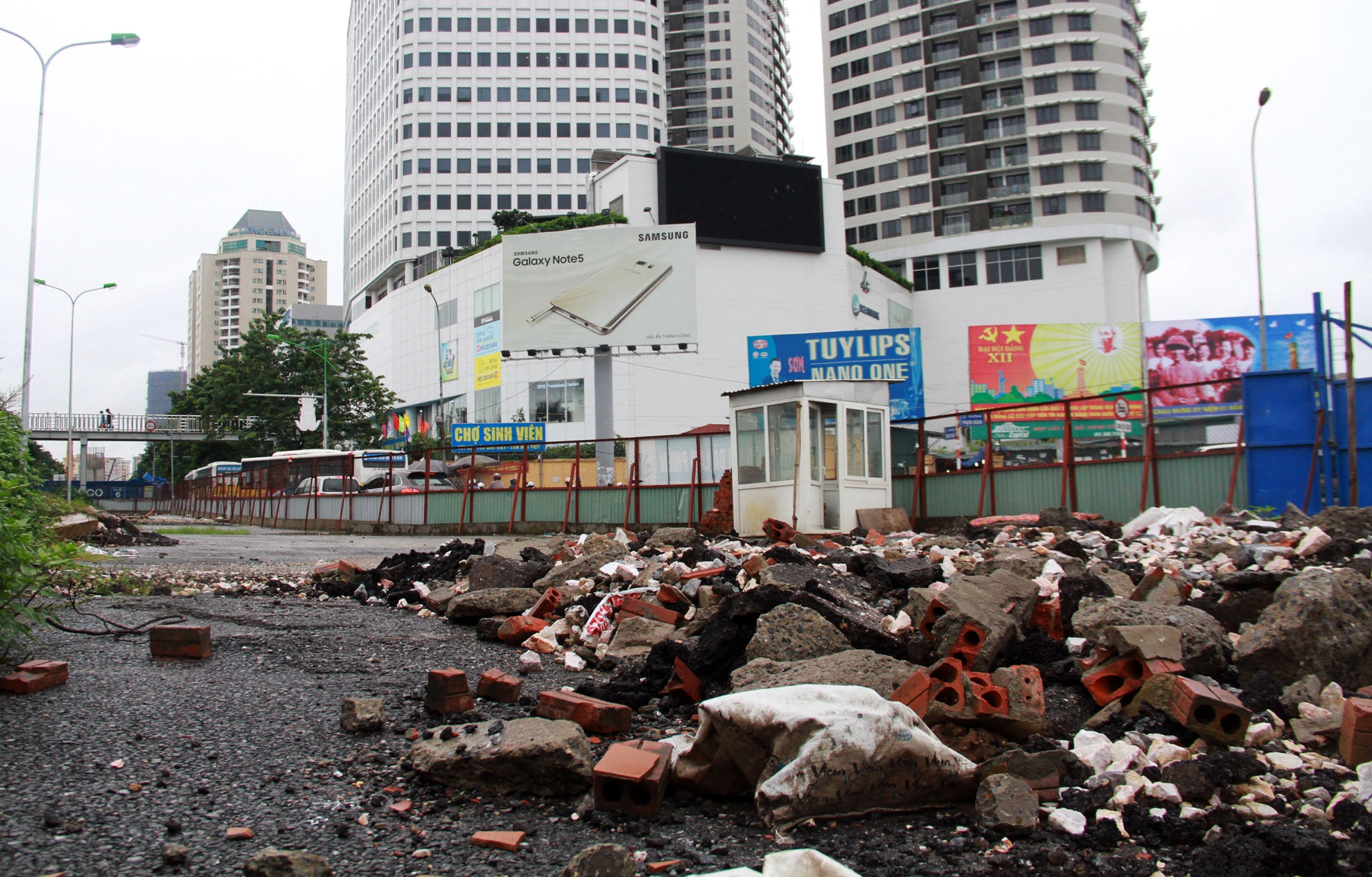 | Vật liệu thải ngổn ngang trong lô cốt trống không thi công đầu ngã tư Xuân Thủy - Hồ Tùng Mậu. |