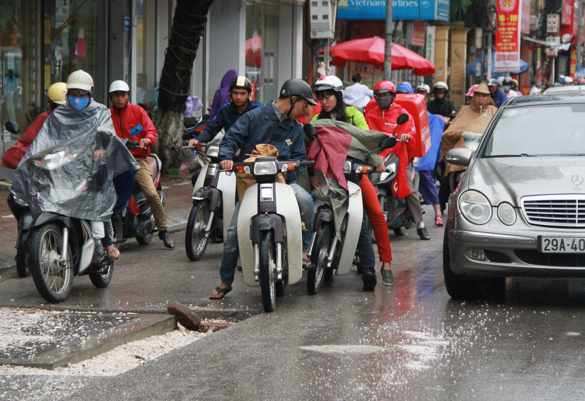 | Không chỉ bị thu hẹp về diện tích, mặt đường Cầu Giấy xuất hiện nhiều ổ gà là các nắp cống thoát nước. Các điểm này được công nhân đắp một lớp sỏi dăm khiến nhiều phương tiện hụt hẫng, trượt dài dẫn đến va chạm. Trong ảnh, tránh ổ gà, thanh niên lái chiếc Dream phanh gấp bị xe máy phía sau đâm trúng. |