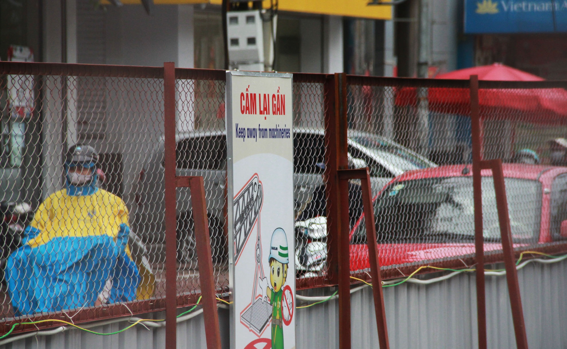 | Biển cảnh báo cấm các phương tiện lại gần công trường đang thi công nhưng quay mặt vào trong. |