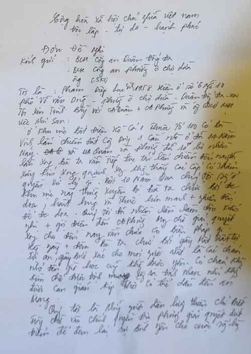 Trong lá đơn kêu cứu gửi các cơ quan chức năng, ông Lục đã tố cáo người ném phân bẩn là bà V., cùng trú tại phường Ô Chợ Dừa.