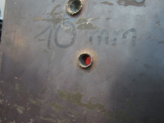 | Đây là một tấm thép dày 10 mm, có 2 vết đạn súng ngắn K59 và súng trường tiến công AK-47. Vết đạn súng AK-47 đã xuyên từ bên này qua bên kia tấm thép. |