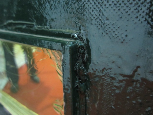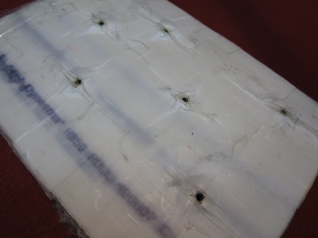 | Mặt trước tấm gia cường của áo chống đạn đã bị thủng. |