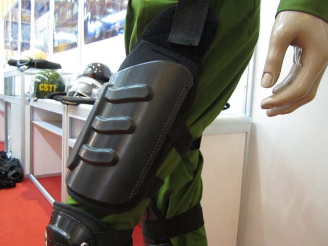 | Ngoài các tấm chống đạn, bộ trang phục bảo vệ của công an còn có các tấm ốp tay, chân chống va đập. |