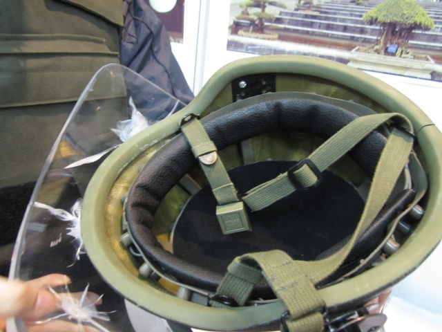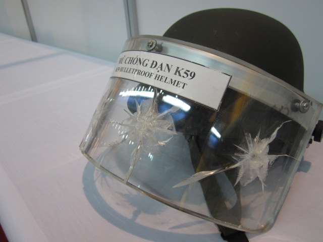 | Mũ chống đạn này có thể bảo vệ chiến sĩ trước đường đạn súng ngắn K59 bắn thẳng. Mặt kính của mũ có hai lớp đảm bảo an toàn cho người chiến sĩ. |