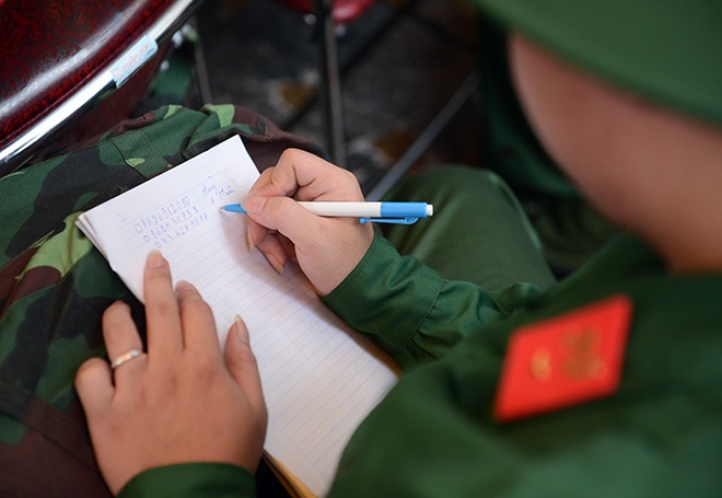 | Nhiều thanh niên được gia đình chuẩn bị đồ ăn nhẹ như bánh mỳ ăn dọc đường, có thanh niên nhanh tay chép lại số điện thoại người thân để liên lạc vì trong doanh trại không được dùng điện thoại. |