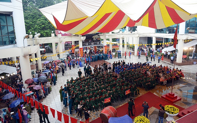 | Mặc dù trời mưa nhưng khá đông nhân dân và người nhà đã có mặt tiễn đưa các thanh niên tòng quân tại triển lãm Vân Hồ số 2 Hoa Lư. |
