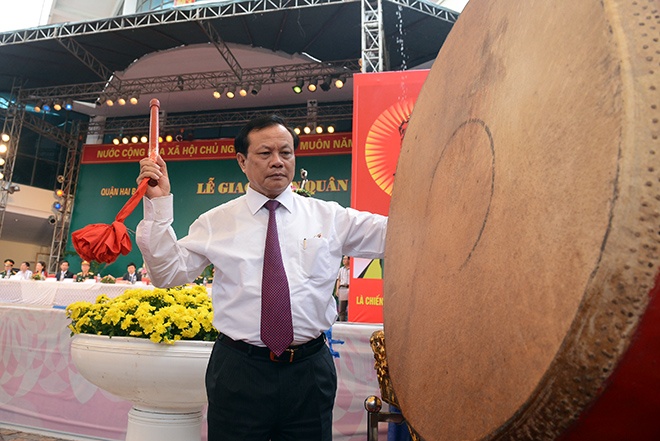 | Bí thư thành uỷ Phạm Quang Nghị đánh tiếng trống tại lễ tòng quân. |