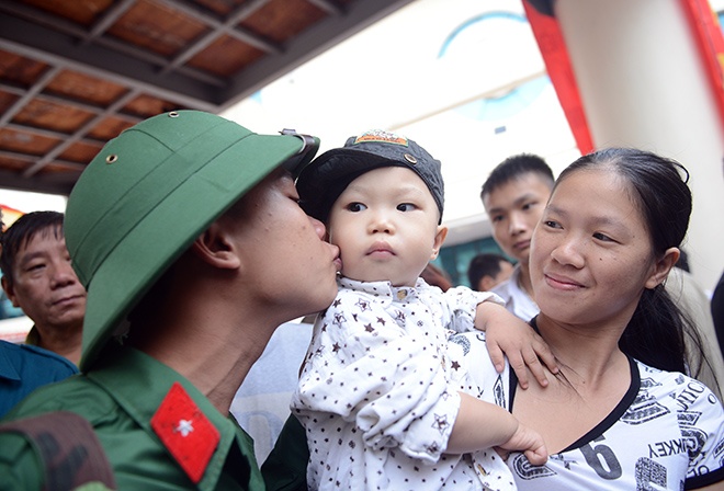 Tân binh Nguyễn Quốc Anh chia tay vợ Dương Thị Kim Dung cùng con nhỏ 9 tháng Nguyễn Trung Dũng lên đường nhập ngũ.