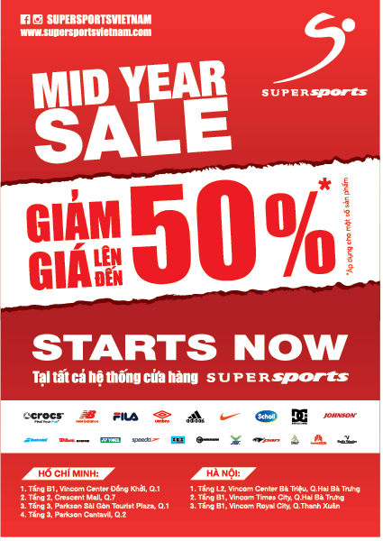 - Đặc biệt: Sale cuối tuần - chỉ trong tháng 7, Supersports sẽ có một chương trình đặc biệt hơn bao giờ: Vào mỗi cuối tuần sẽ có một số sản phẩm của một thương hiệu nổi tiếng bán với giá sốc (chỉ trong 2 ngày). Đến ngay các cửa hàng Supersports vào cuối tuần và khám phá các ưu đãi bất ngờ này.