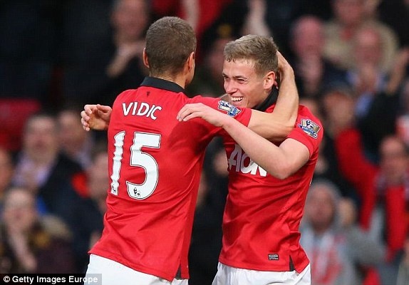 | Trung vệ Vidic, cầu thủ chia tay M.U sau khi mùa giải năm nay khép lại, chia vui cùng James Wilson. |