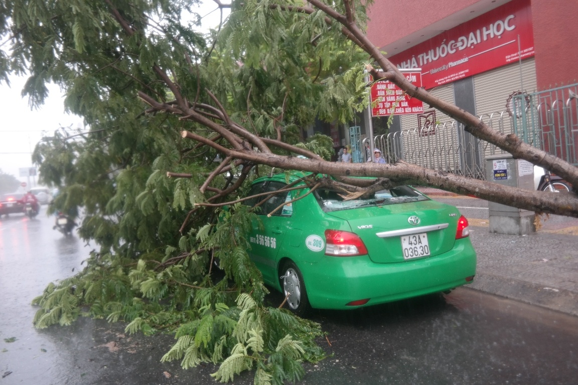 Mưa to liên tục từ sáng sớm khiến hàng loạt cây xanh ở Đà Nẵng bị ngã. Một chiếc xe taxi đậu trên đường bị cây đè bể kính, may mắn tài xế thoát nạn.